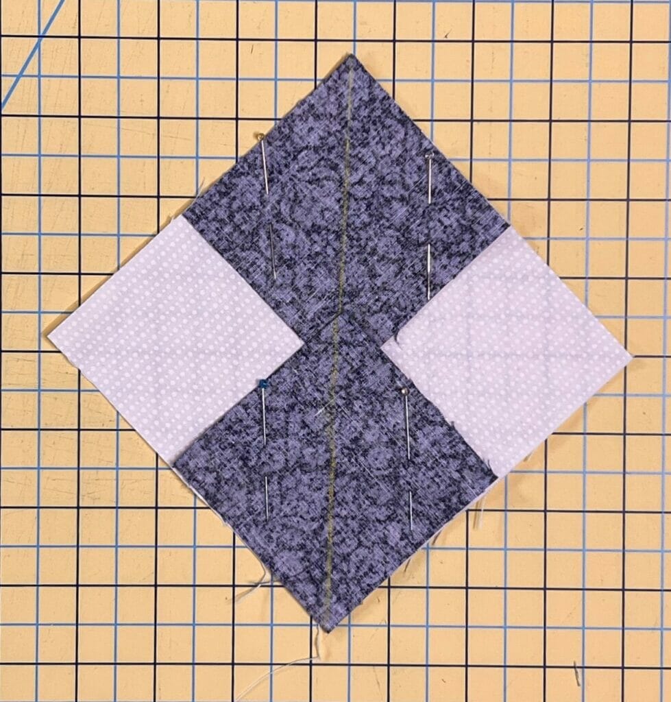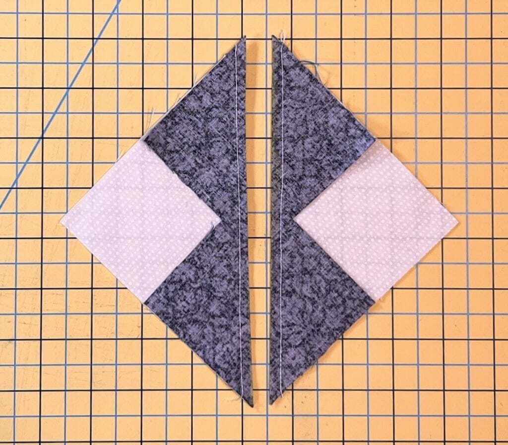 Below you can see on the left that I’ve trimmed off the tail and am ready to pin on the next triangle. On the right is how the second triangle is placed for pinning and sewing.