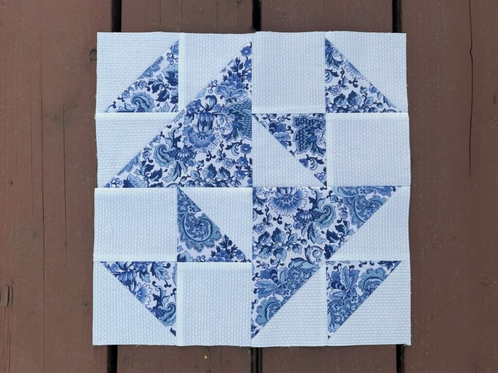 Now all we have to do is sew the 4-patch units and the triangle units together to complete the block. Make sure you pay close attention to the diagram in the pattern, so that you have all your triangles in the right spot.