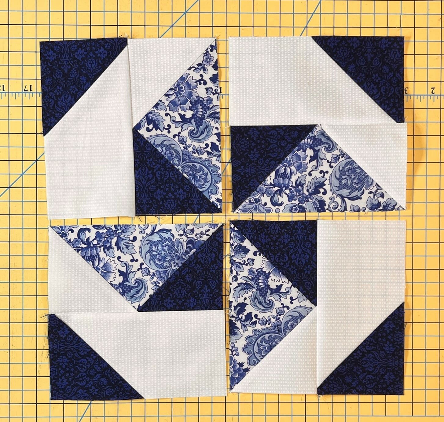 To finish the block, simply sew the four units together like the photo shows below. Make sure you rotate them as outlined in the instructions so that you end up with a pinwheel in the center.