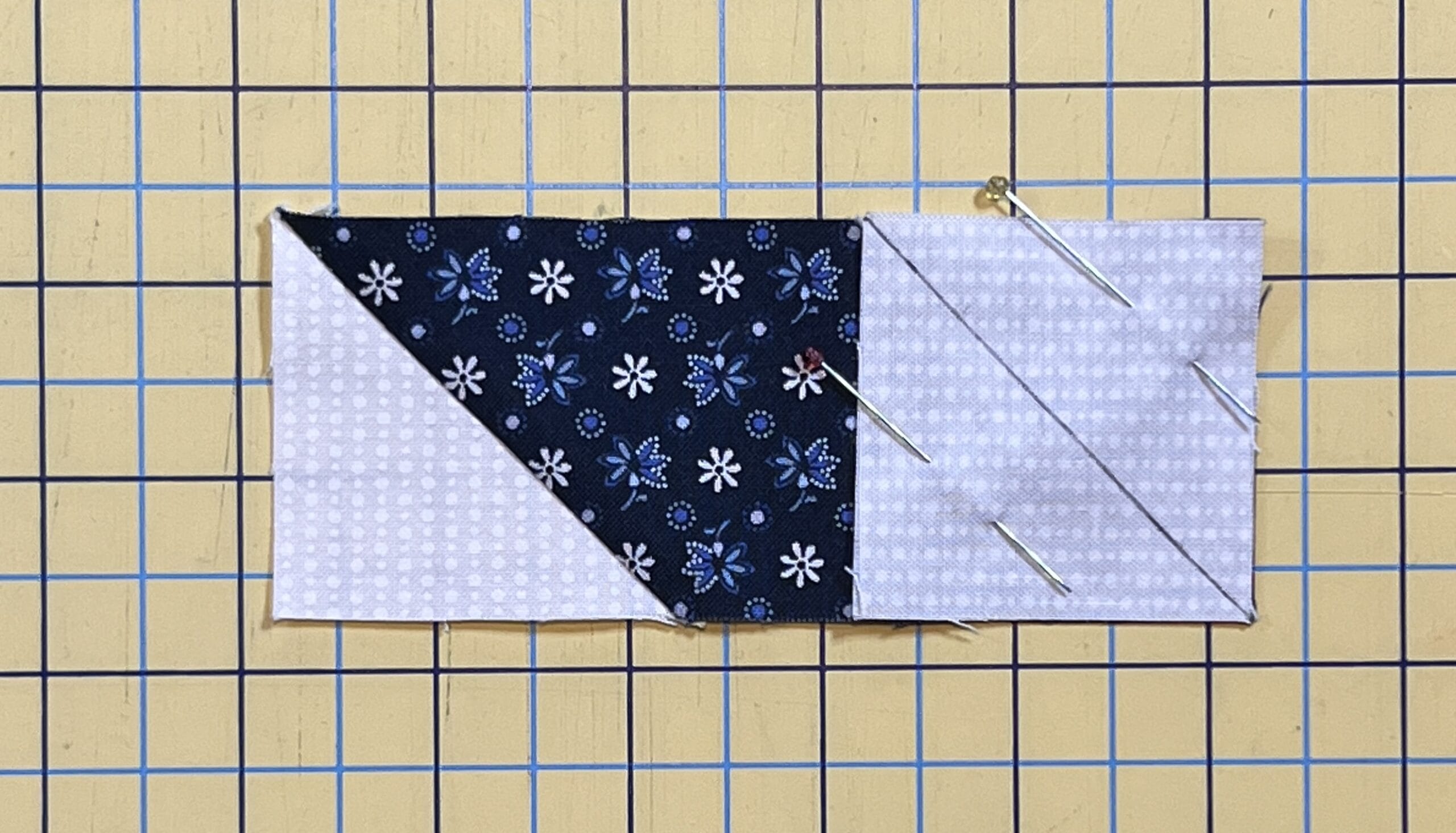 The first thing we will make are the star points. It’s very important to pay close attention to the placement and direction of the drawn lines on the C squares. The first set of four we will make begins by placing a C square on the left side of the D rectangle, with the marked line going from the upper left to the lower right. Stitch on the marked line (or just a hair outside of it, as I’ve suggested before), trim to a ¼” seam allowance, and then press TOWARD the blue fabric.