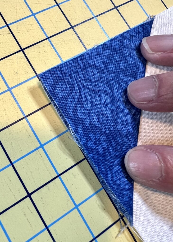 As I’ve mentioned in previous blog posts for this quilt, before I cut off my excess to the 1/4″ seam allowance, I always flip them up to make sure they line up at the corners.