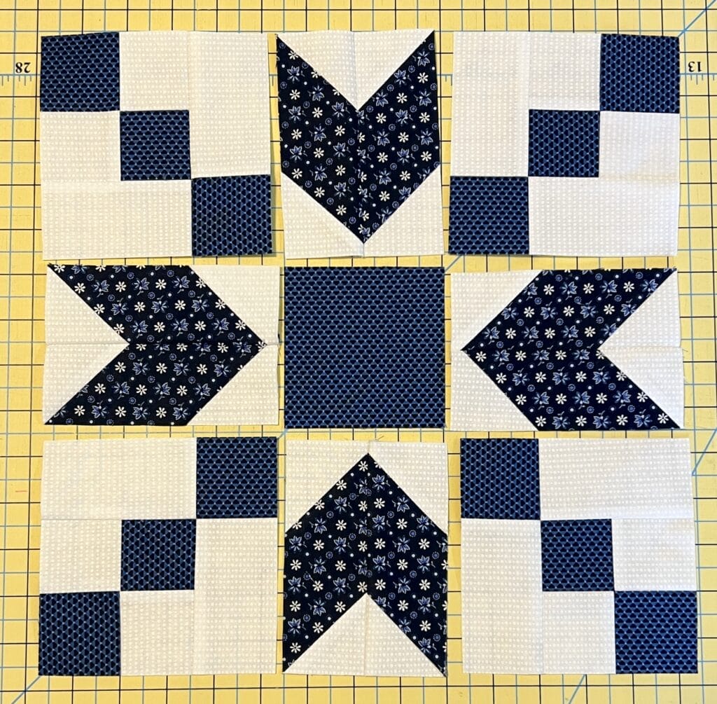 This block is SO MANY flying geese! I decided to use the stitch and flip method, because we are making 9 of each. The no waste method makes flying geese in batches of four, so we would have ended up making way more than we needed if we made them that way, which kind of defeats the purpose of “no waste”.