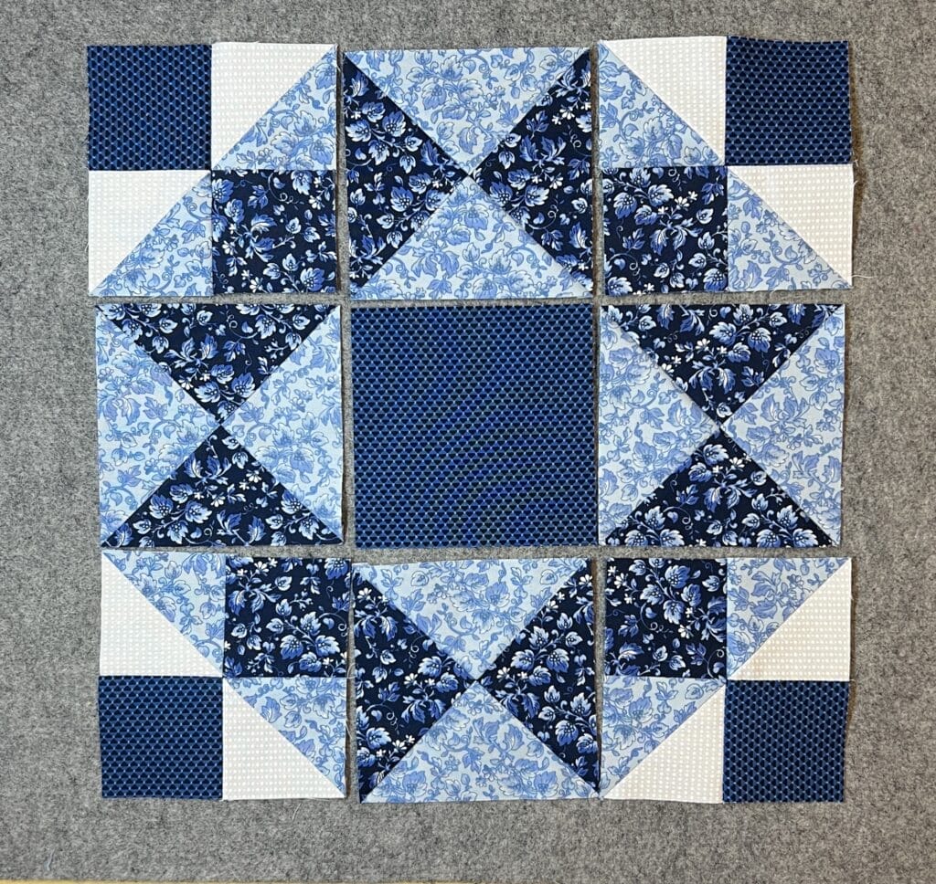 In step 5, you’ll make a 9-patch unit with the flying geese units framing the pinwheel center, with some squares in the corners.