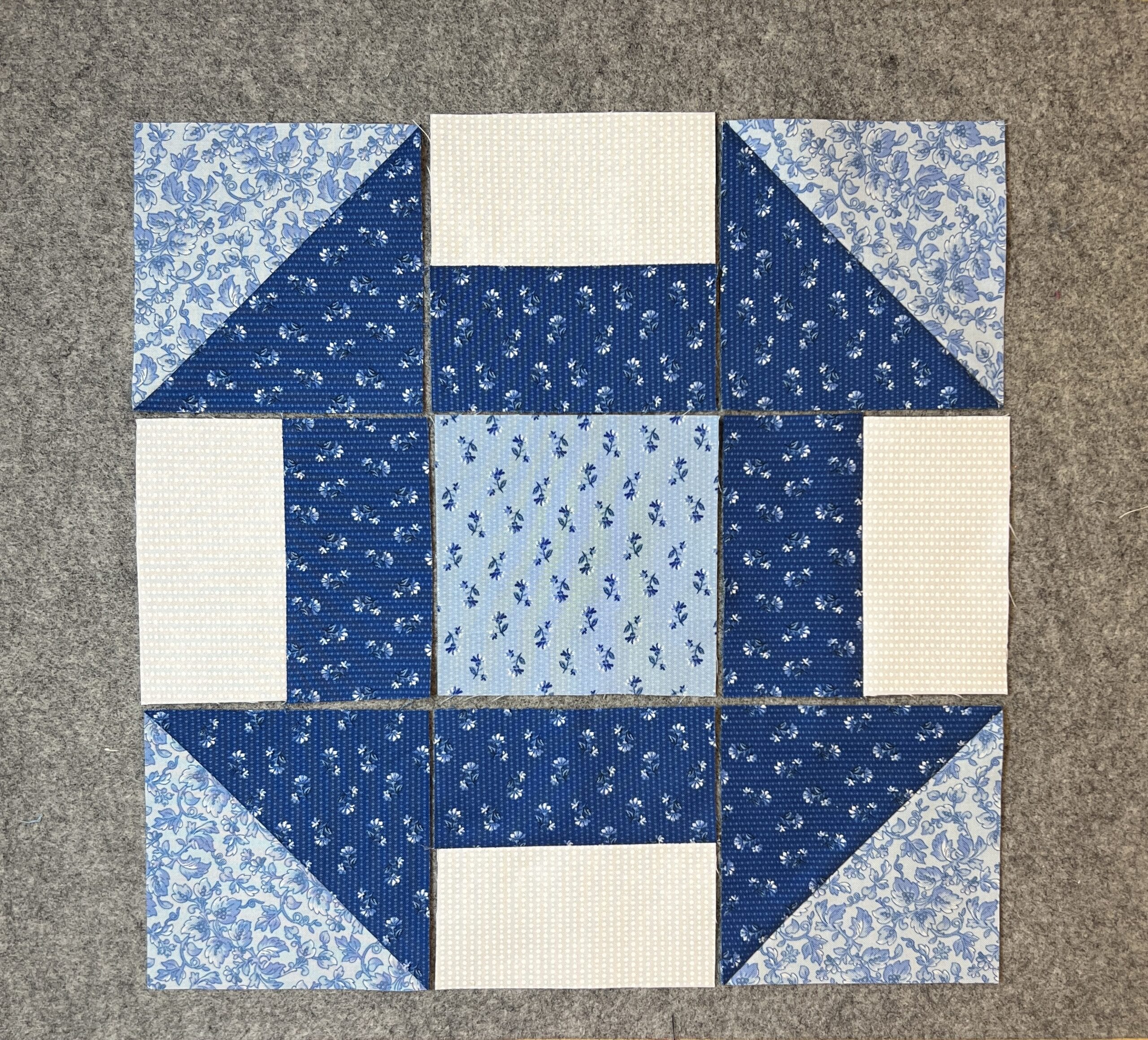 In step 5, you’ll make a 9-patch unit with the flying geese units framing the pinwheel center, with some squares in the corners.