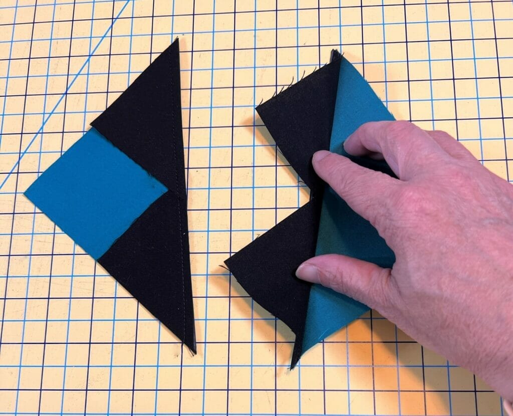 These Lagoon squares are sewn one at a time and trimmed as you go, just like you’ll see in the photos below. All the seams are pressed outward for these.
