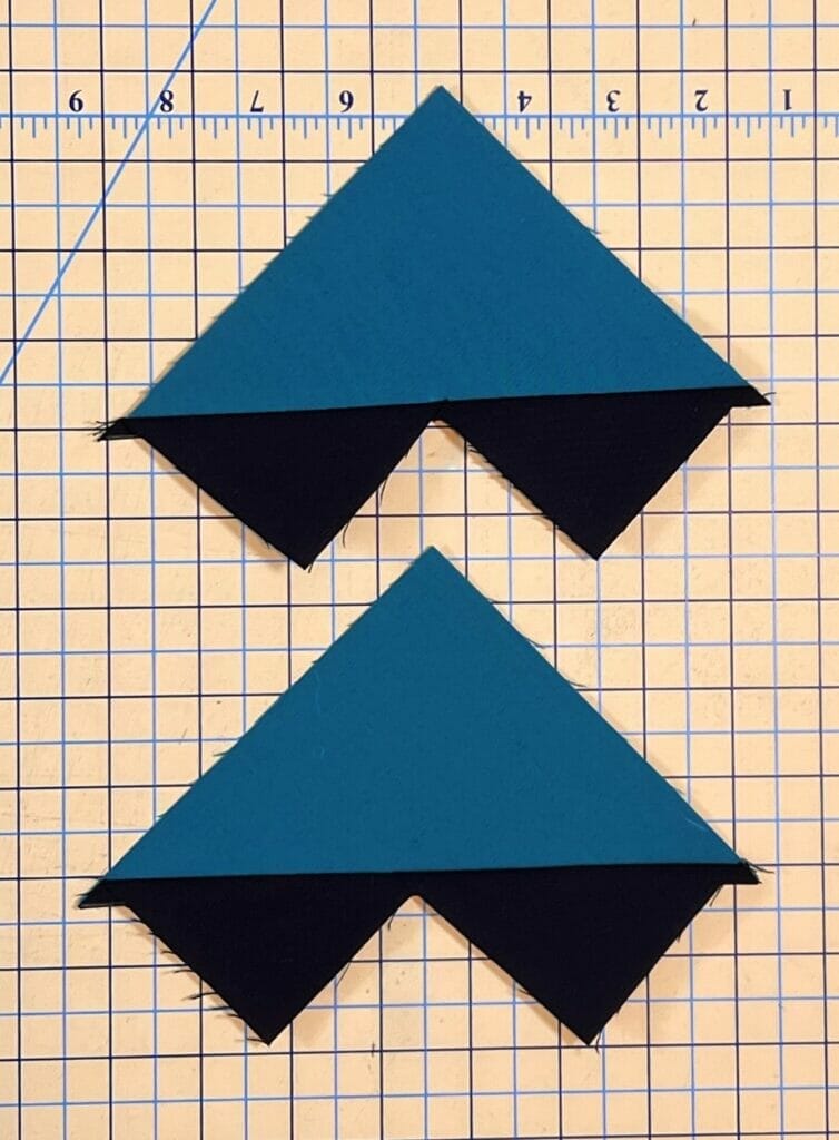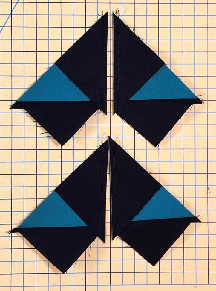 Press the triangles away from the units, and voila! You now have 4 flying geese units! Trim these up to 2-1/2” x 4-1/2”. Repeat this for all the A and E pieces you’ve cut, and you’ll end up with 32 flying geese when you are done.