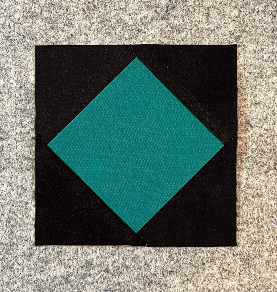 Like I mentioned before, this month we also get a bit of a head start on making some of our diamond squares for the border. These are exactly the same as the square-in-a-square units we made in step 1 for our Star block, only the colors are reversed. I won’t repeat a full tutorial, but you can get the gist of what they will look like below. You don’t have to make all 36 this month, but even knocking out 8 a month for the next few months will save you some work down the road.