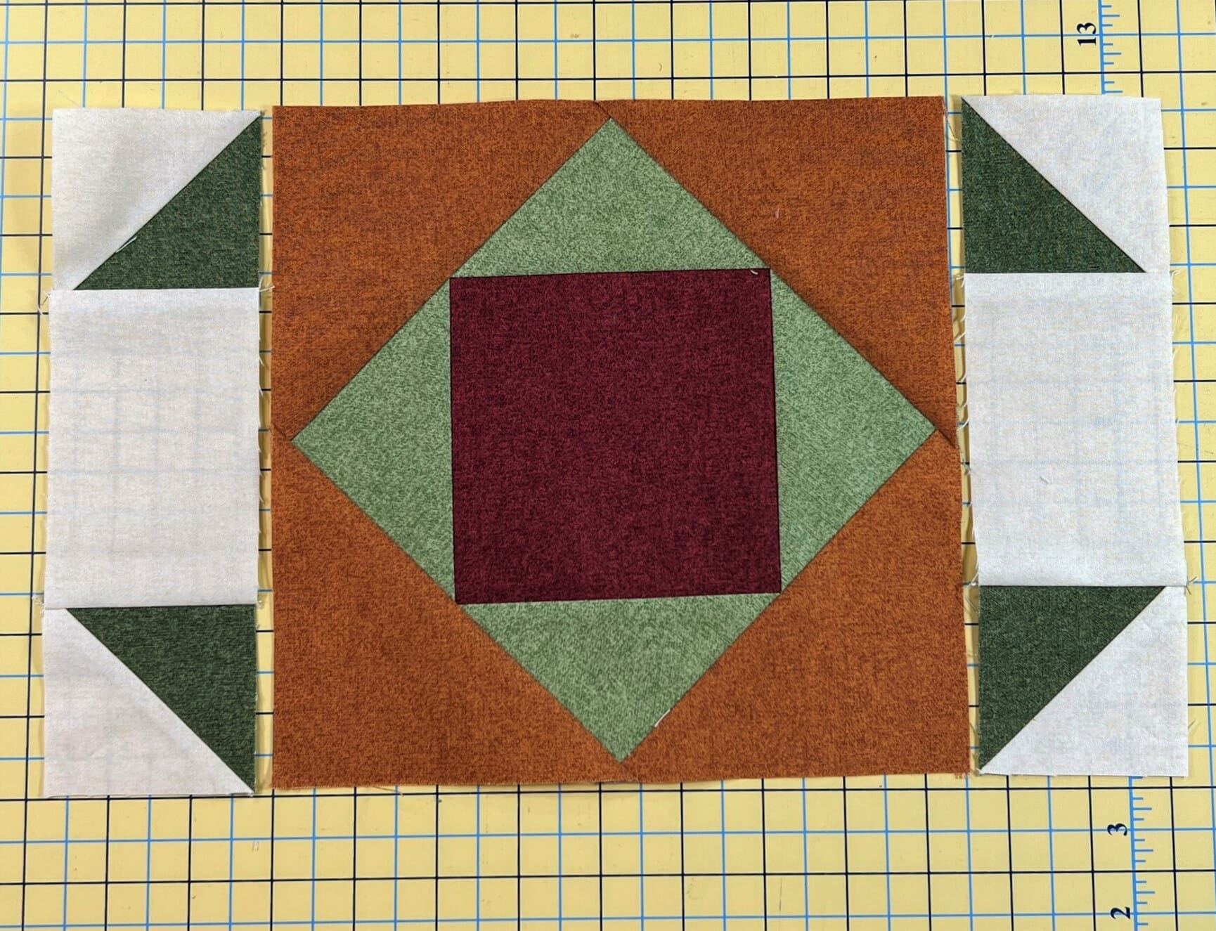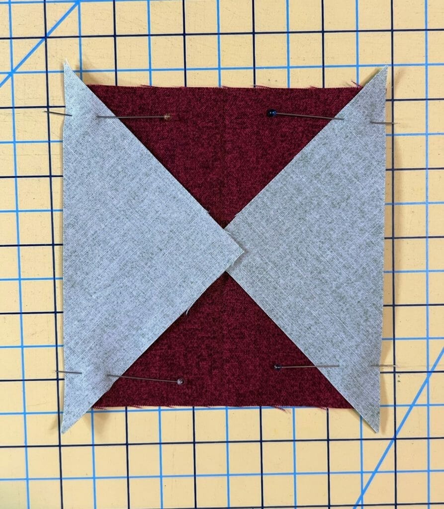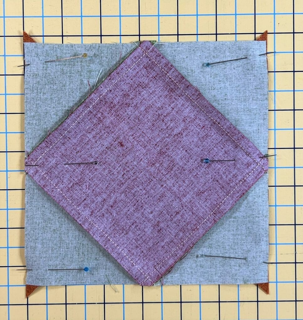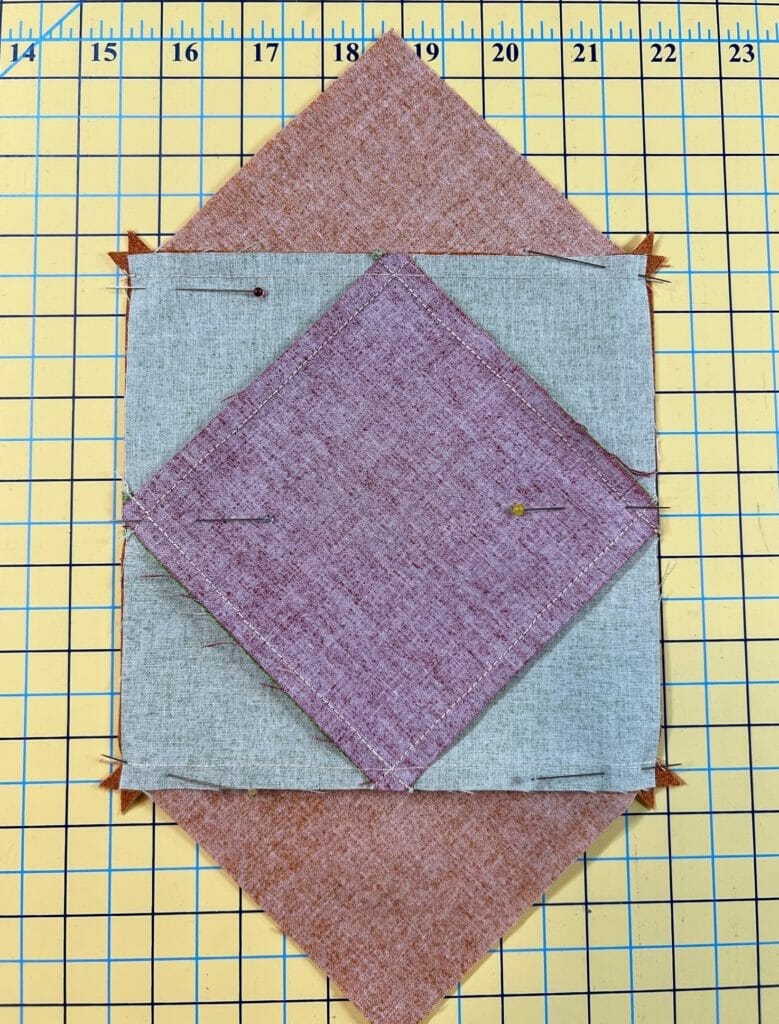 I always cheat a little when sewing these square in a square units. I like to pin the triangles on two at a time, rather than one at a time, like you see in the photo. This way I can sit at the sewing machine and sew longer. I also recommend trimming off the little tails that will hang out, once you finish each step. Make sure you square measures 6-1/4” square at the end of step 1.