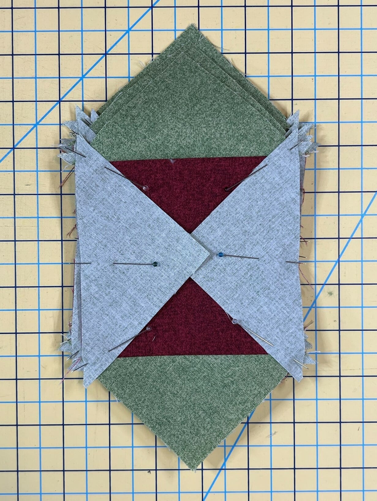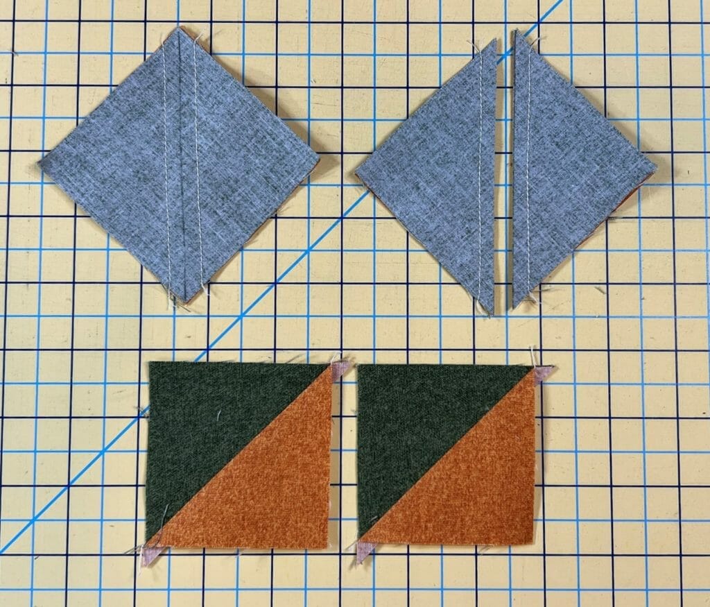 Step two is just a repeat of step 1. I like to pin my triangles on the underside before sewing. This allows me to make sure that I’ll be stitching right through that triangle point perfectly. At the end, you hopefully have a square that measures 8-1/2”. Please make sure that if you do any trimming, that you maintain a ¼” seam allowance at those points. Sometimes things can get wonky, no matter how hard we try. When this happens to me, I still make sure I keep those points at a ¼” seam when I’m trimming, and then I adjust my sewing in the subsequent steps.