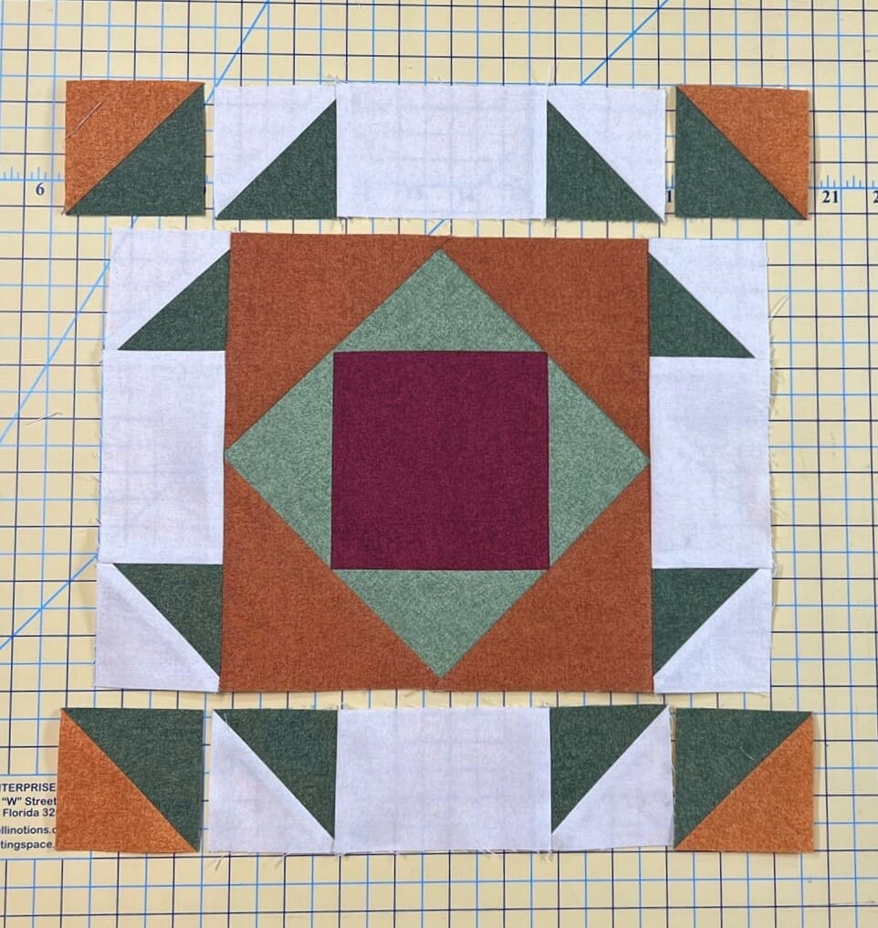 After that’s done, we’ll sew the D/E squares to the ends of the remaining strips from step 5, and then sew them to the top and bottom to complete our blocks.