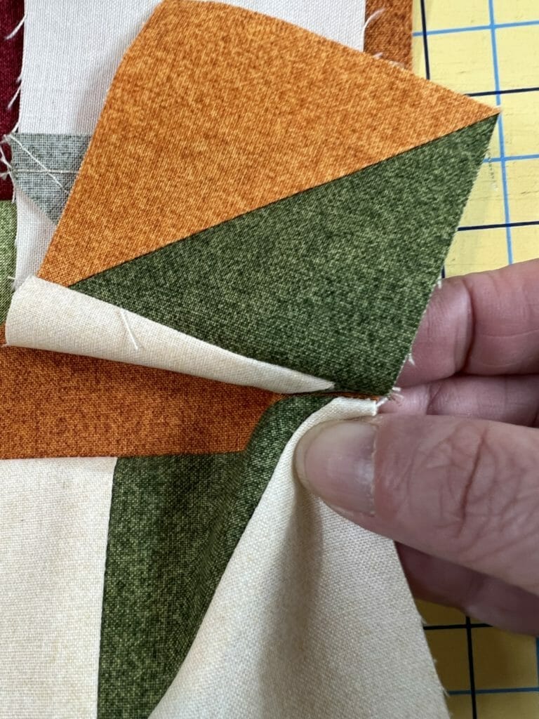 Once you’ve cut everything out, you’ll sew the B triangles, one at a time to each of the four sides of the A square. I find it helpful to finger press the square down the middle to use as a guide for placing the triangles. You want the point of the triangle to align with the fold. In the photo below you can make out the fold line down the center. Once you sew on the first two triangles, you can finger press another fold going the other way as a guide for the remaining two triangles.