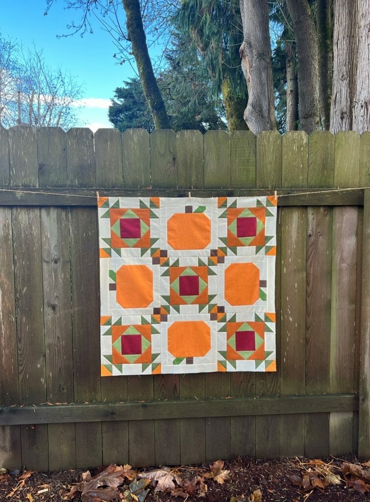 Make sure that you pay attention to the orientation of the pumpkins as you sew these blocks together. The pumpkins should all be facing away from the center. When it’s done, the quilt top should now measure 36-1/2” square. I couldn’t resist taking mine outside for a photo on such a beautiful fall day!