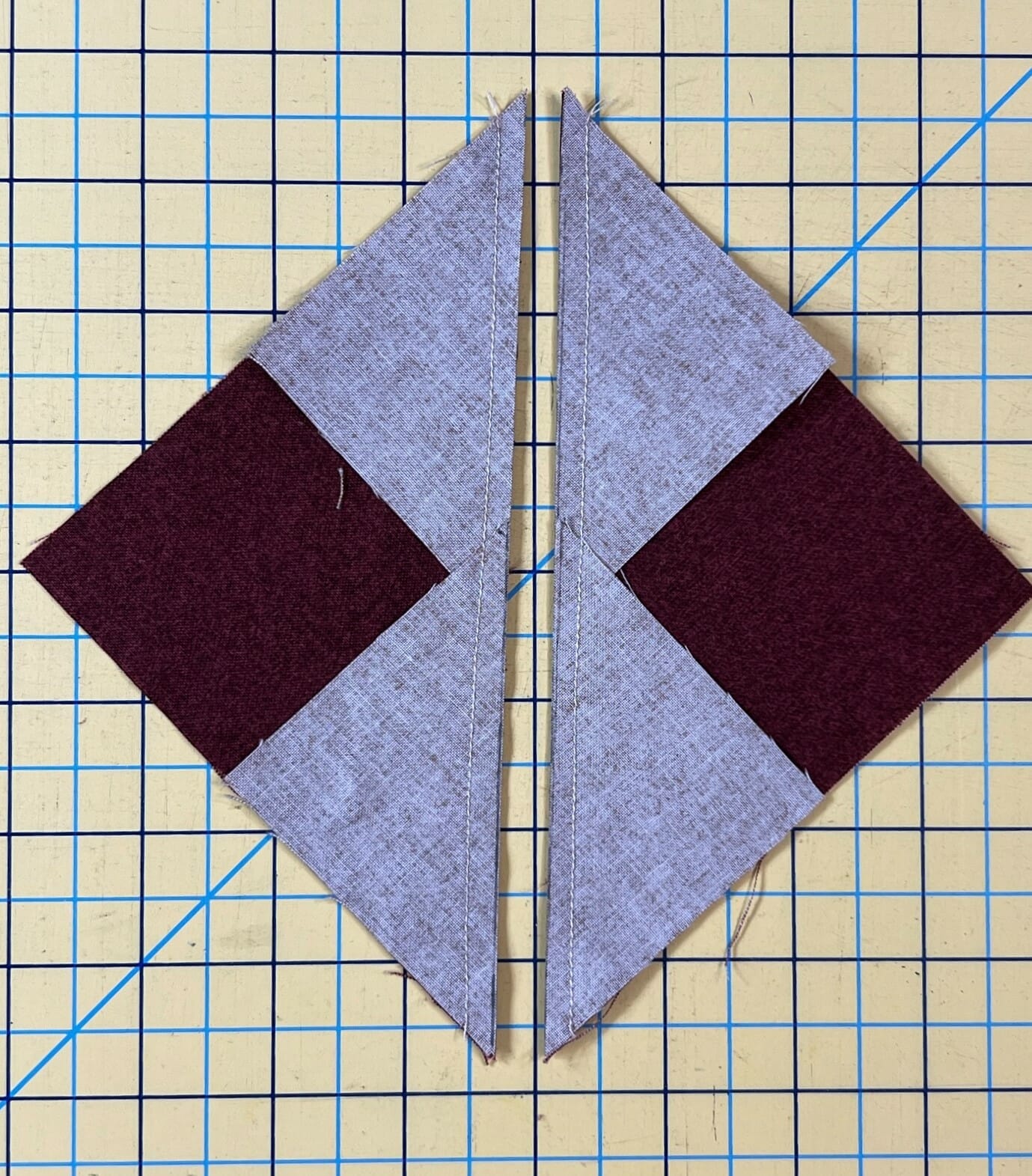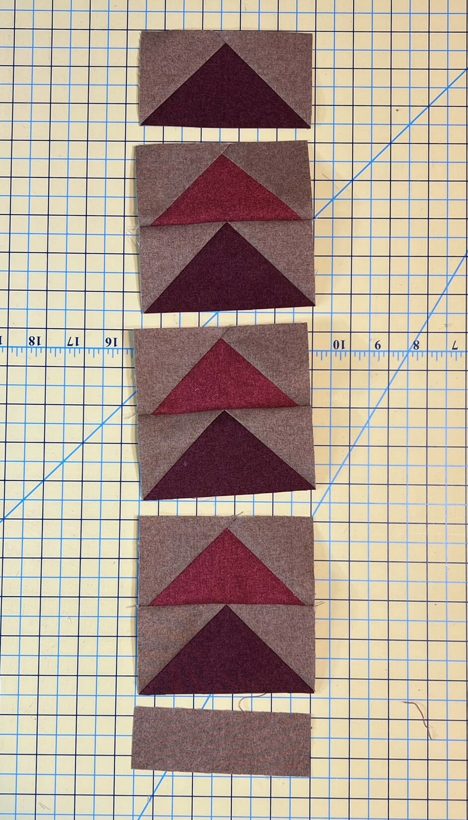 Presto! You now have four flying geese for each 5-1/4” square! Make sure you measure and trim these as needed to 2-1/2” x 4-1/2”. I know there are a few more methods out there, so drop a comment to tell me your favorite!