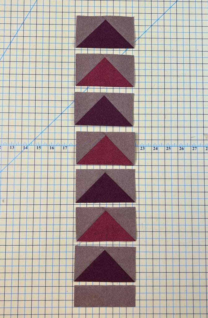 Once all your flying geese are made it’s time to sew them into strips – eight to be exact. Each of the eight strips will consist of three A/D units sewn in between four A/C units.