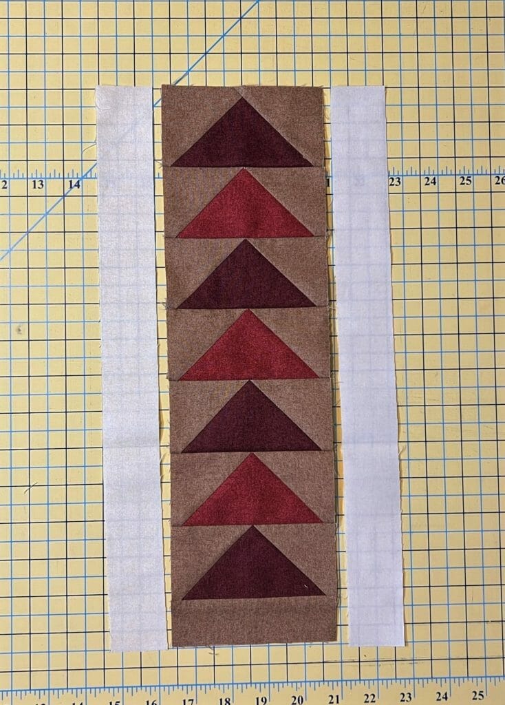 It is key to make sure each unit measures 15-1/2” long when done. One way to make sure these will be accurate, is to cut each E strip exactly, and then ease in the flying geese strips as you attach the E strips to the sides. This way, in step 4, you will end up with the correct measurements. If the flying geese units are too long, you can spray some starch on them and let them rest. This is a little trick I use that shrinks up the fabric just a bit and helps with easing things in.