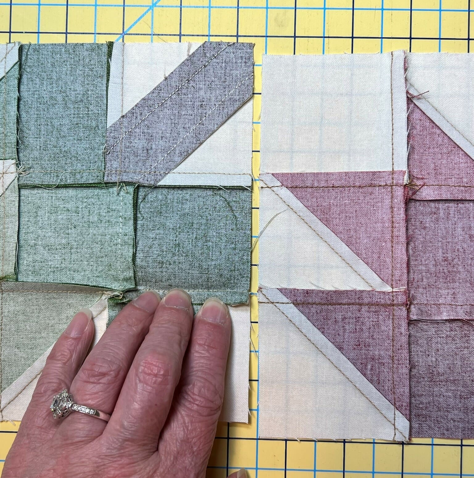 TIP: You may notice as you sew these, that some of the seams don’t nest together, so here’s what I did to remedy that: After placing everything on my design wall, I started sewing from left to right, one block at a time. This allowed me to check each set of intersecting seams between blocks, and re-press those seams going the opposite direction whenever necessary, as I moved along the row.