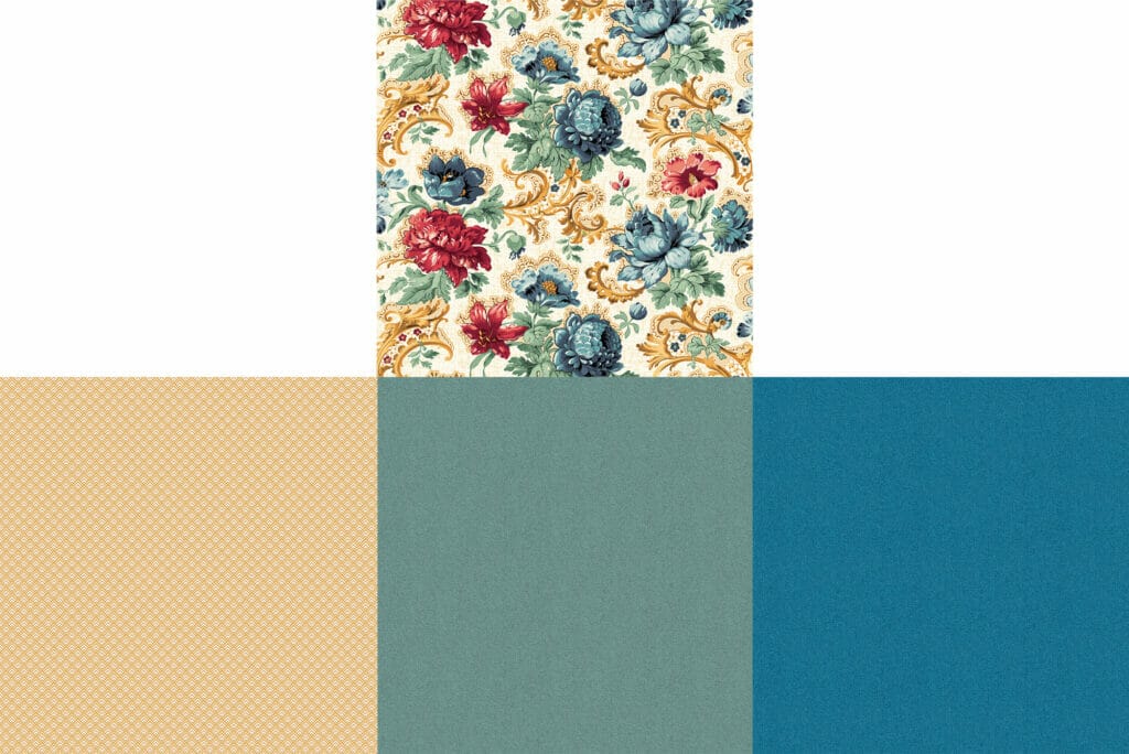 Sorting through the stash of fabrics at Connecting Threads’ sewing room (yes, it’s as fantastic as you think it is!), I spotted Lady Montague II, the main floral from Belles Fleurs. It shows off exact or very similar colors to my trio. The background of cream and swirls of gold can lean towards taupe, like this geometric print Staggered. The leaves are a perfect match for Faux Linen in Dusty Aqua, which I translated directly from the original color palette. Last is Azure in Faux Linen; while it might not match perfectly, it’s a bolder hue than the teal flowers, giving the whole color scheme a punch of vibrancy.
