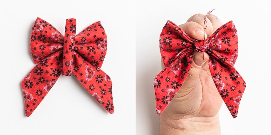 Voilà, you have a beautiful fabric bow! Nudge any of the pieces to straighten things out. If using a hair clip, you can slide it right between the tie piece and the bow piece – this is why we don’t sew everything together, so it’s easy to adjust and customize with pins, hair clips and more!