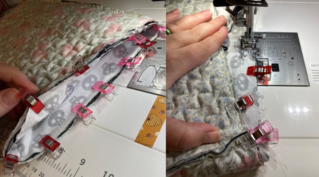 Once basted, the slip pocket and front unit were clipped right-sides together with the quilted back piece. With a ¼” seam allowance, I sewed along the left, bottom, and right sides, being sure to back stitch and the beginning and end.