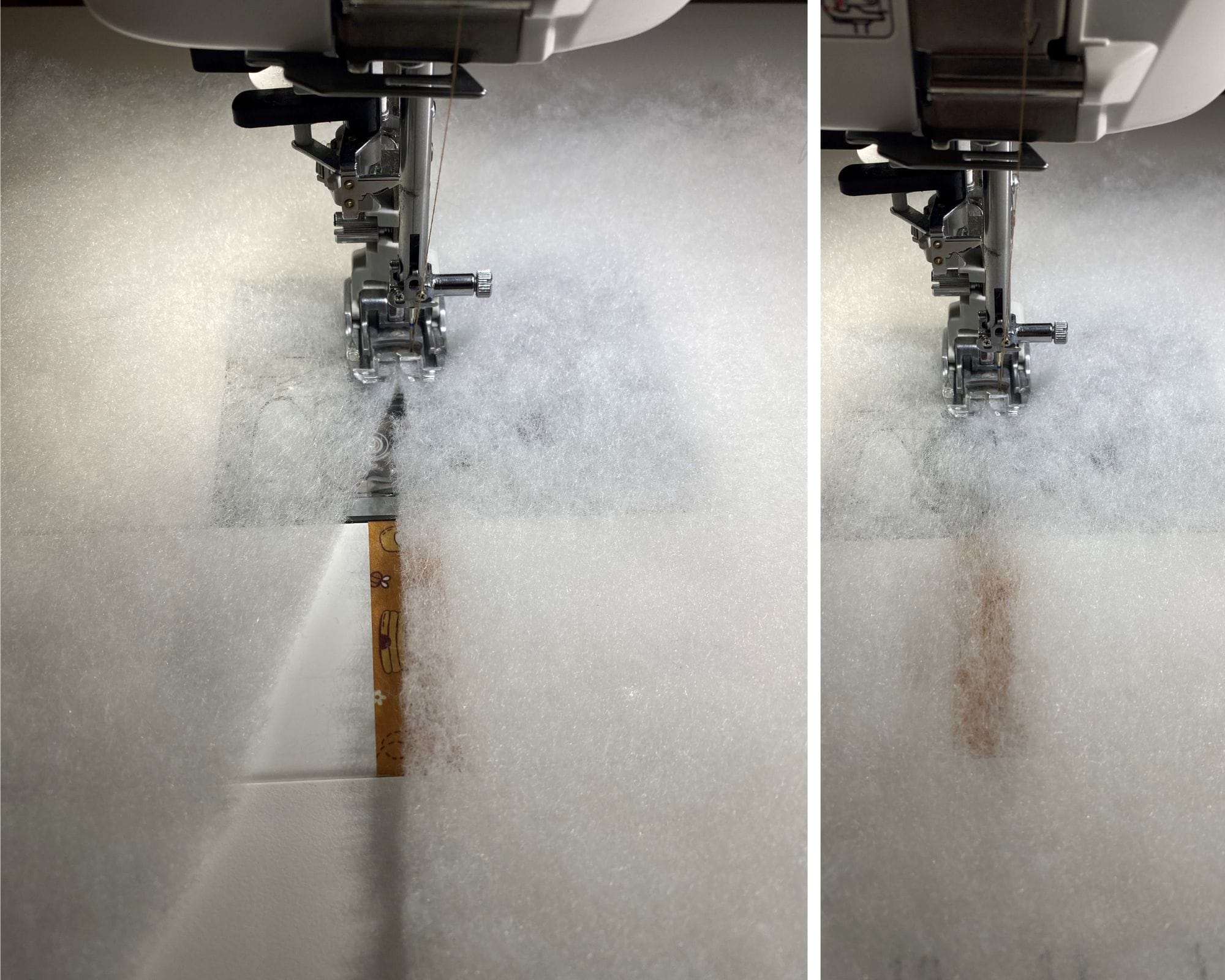 Using a small scrap of fabric to start the first few stitches will help keep your batting from catching against the feed dogs and getting stuck in the needle plate. Once the first few stitches are caught, a quick line of zig-zag stitches across the length of batting is all that is needed. Be sure not to overlap the batting or it’ll cause uneven bumps of doubled thickness.