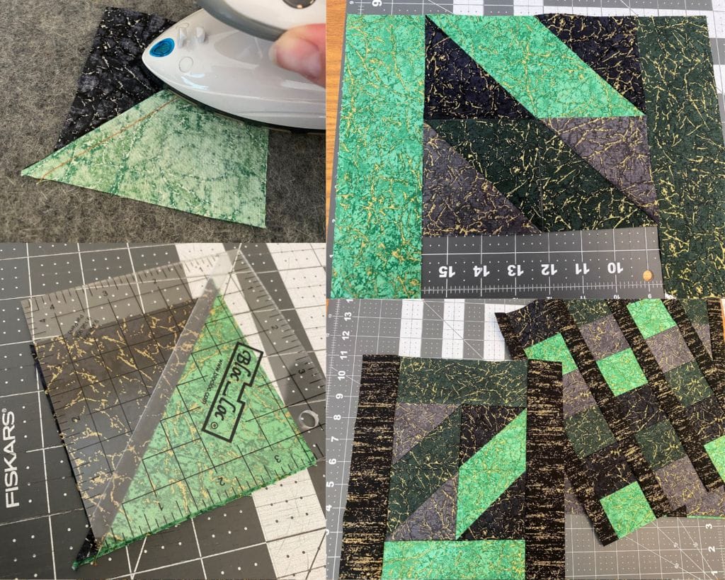 I sewed the HSTs together and added some 2.5” sashing to each side until it measured roughly what I needed, then pressed and trimmed the whole piece to 9.5” x 9”.
