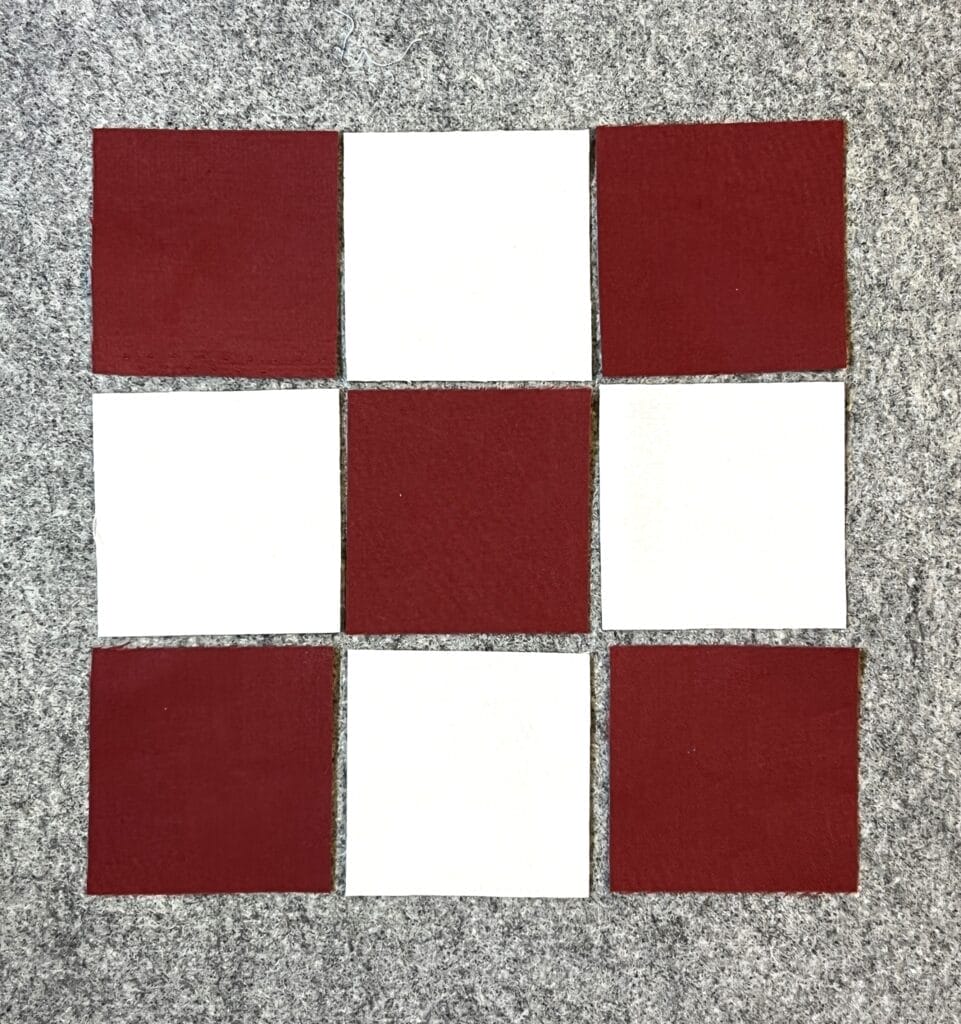 This block begins by making a simple 9-patch. The instructions state that you cut out the Cream and Barn Red squares individually, then sew them together.