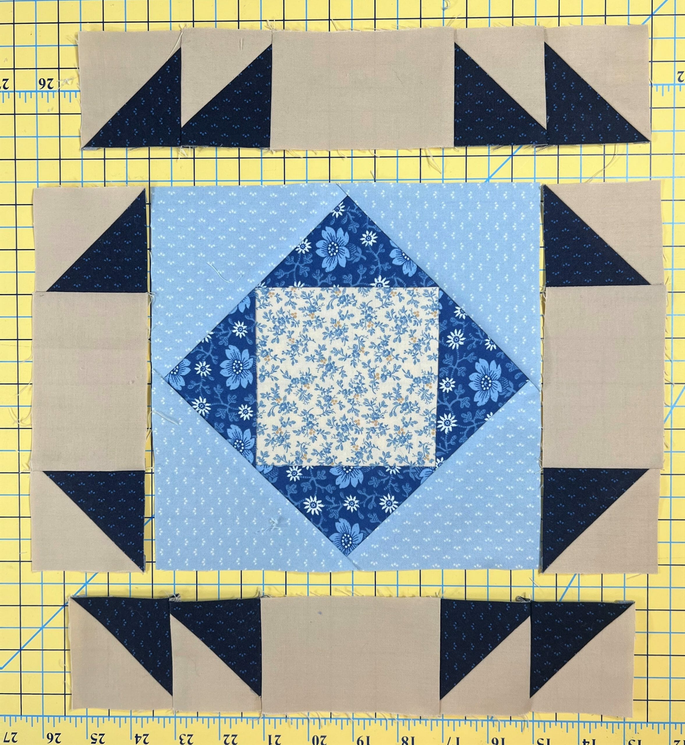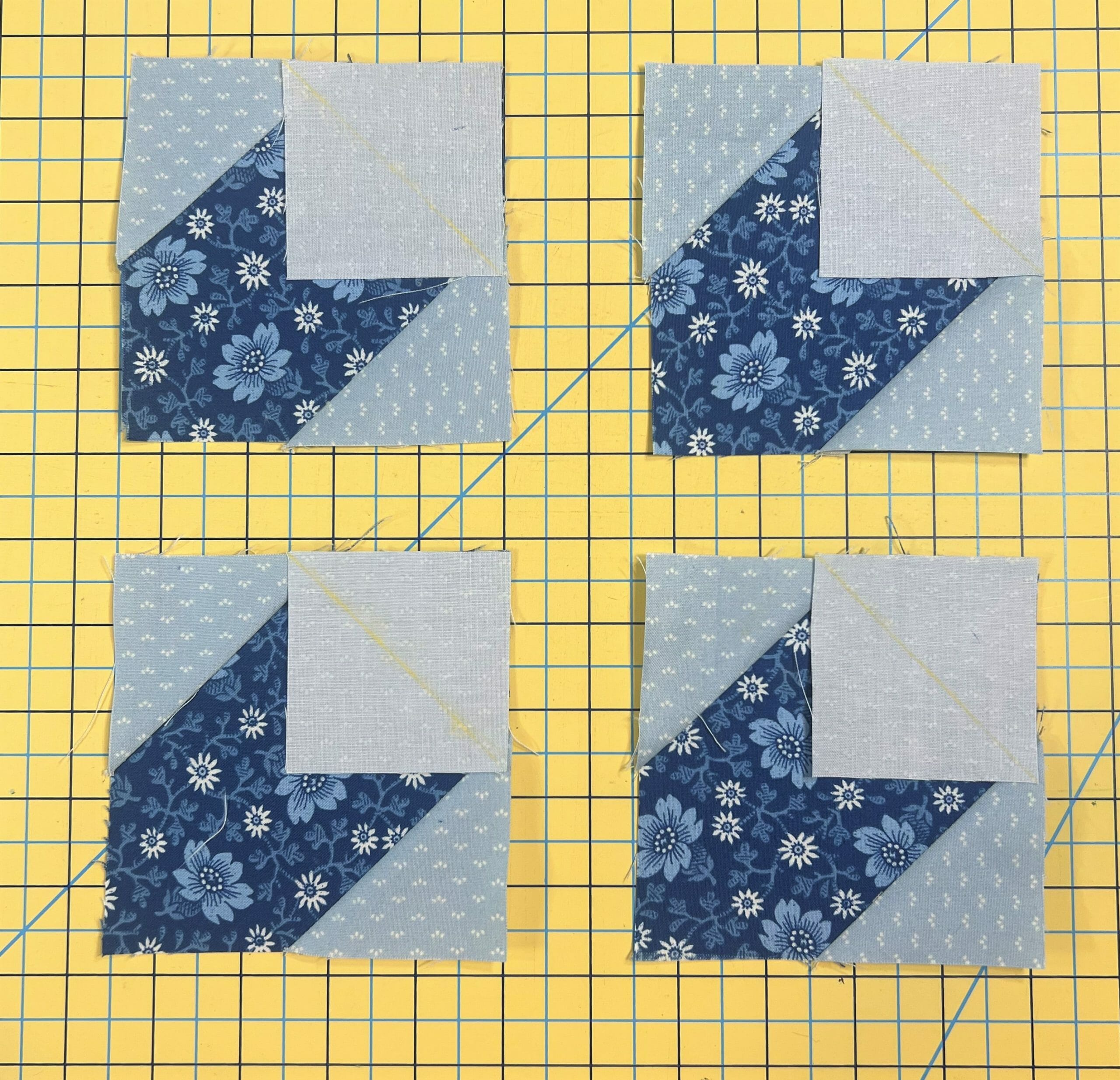 As you’ll notice two of the blocks have the dark blue E squares as the last square to attach for this unit, and the remaining two (in step 3) have the cream F square as the last one. This makes for a fun little design in the center when sewn together. Please also note that the cream F squares are also pressed toward the D square, and not away. Again, it’s all about getting those seams to nest.