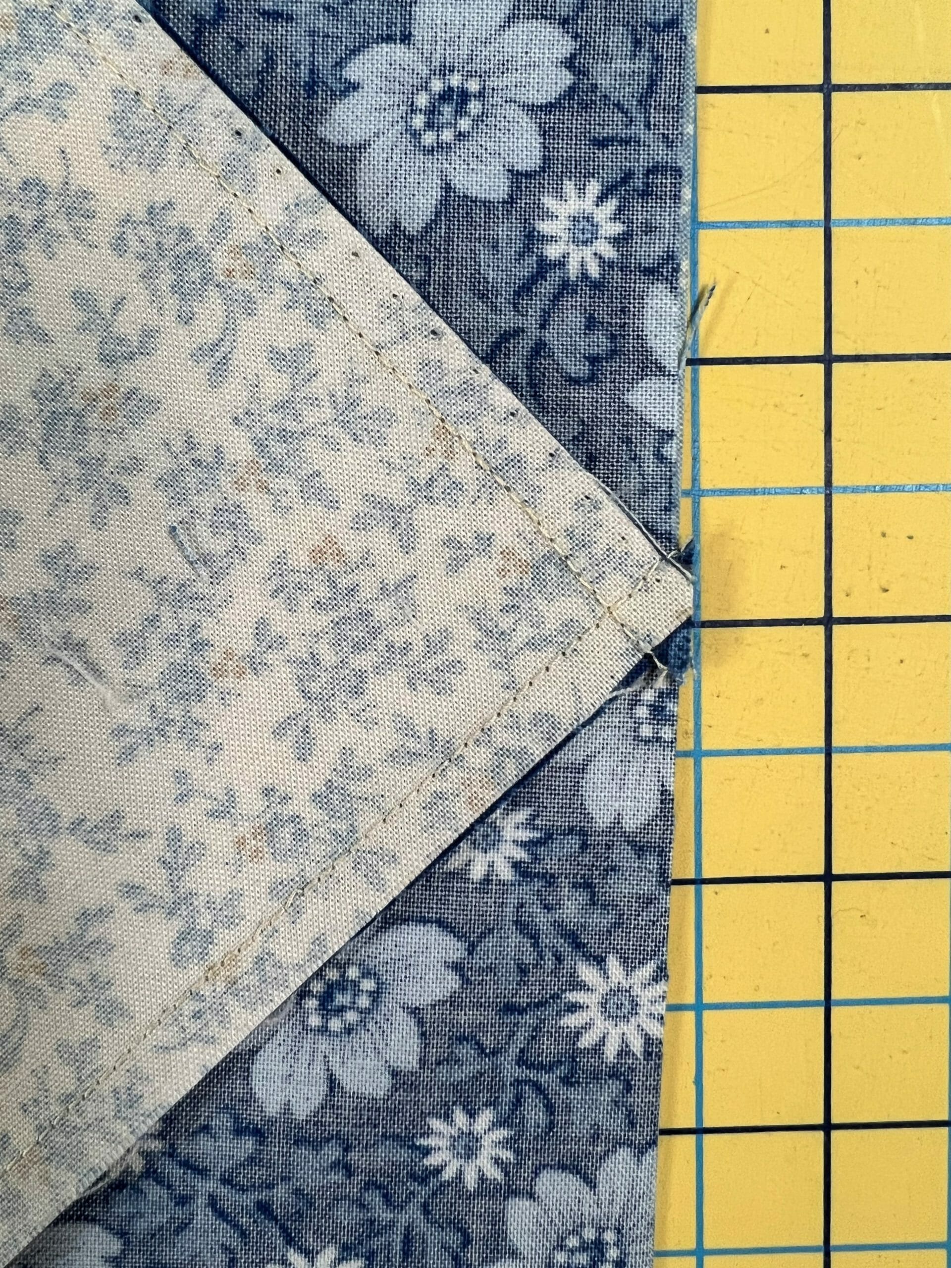 You want to make sure you are sewing right through the intersection of the two sewn lines of the triangle point, like you see above.