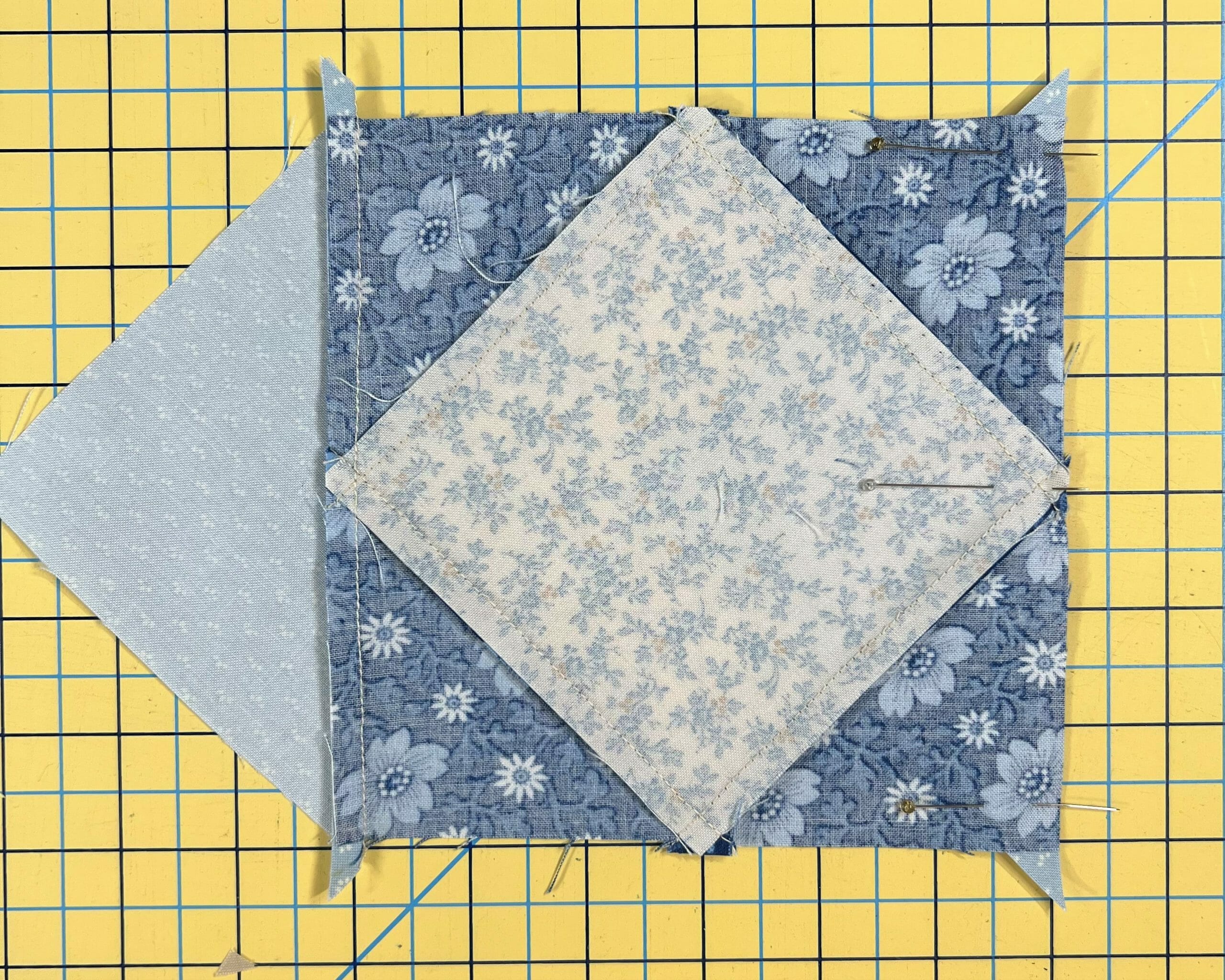 Below you can see the finished square, with the additional larger triangles placed around to get ready for pinning.
