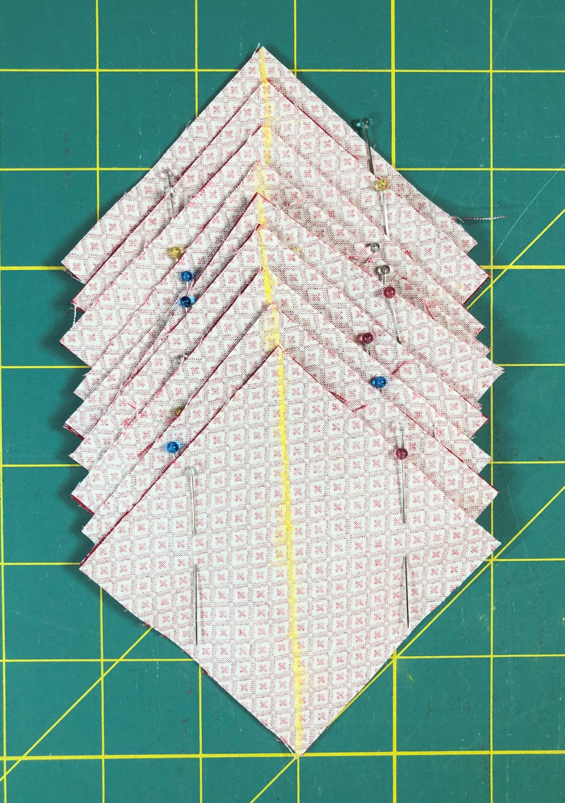 After the pinwheels are finished, there is more assembly line pinning and sewing to get all the D strips to the sides of the pinwheel.