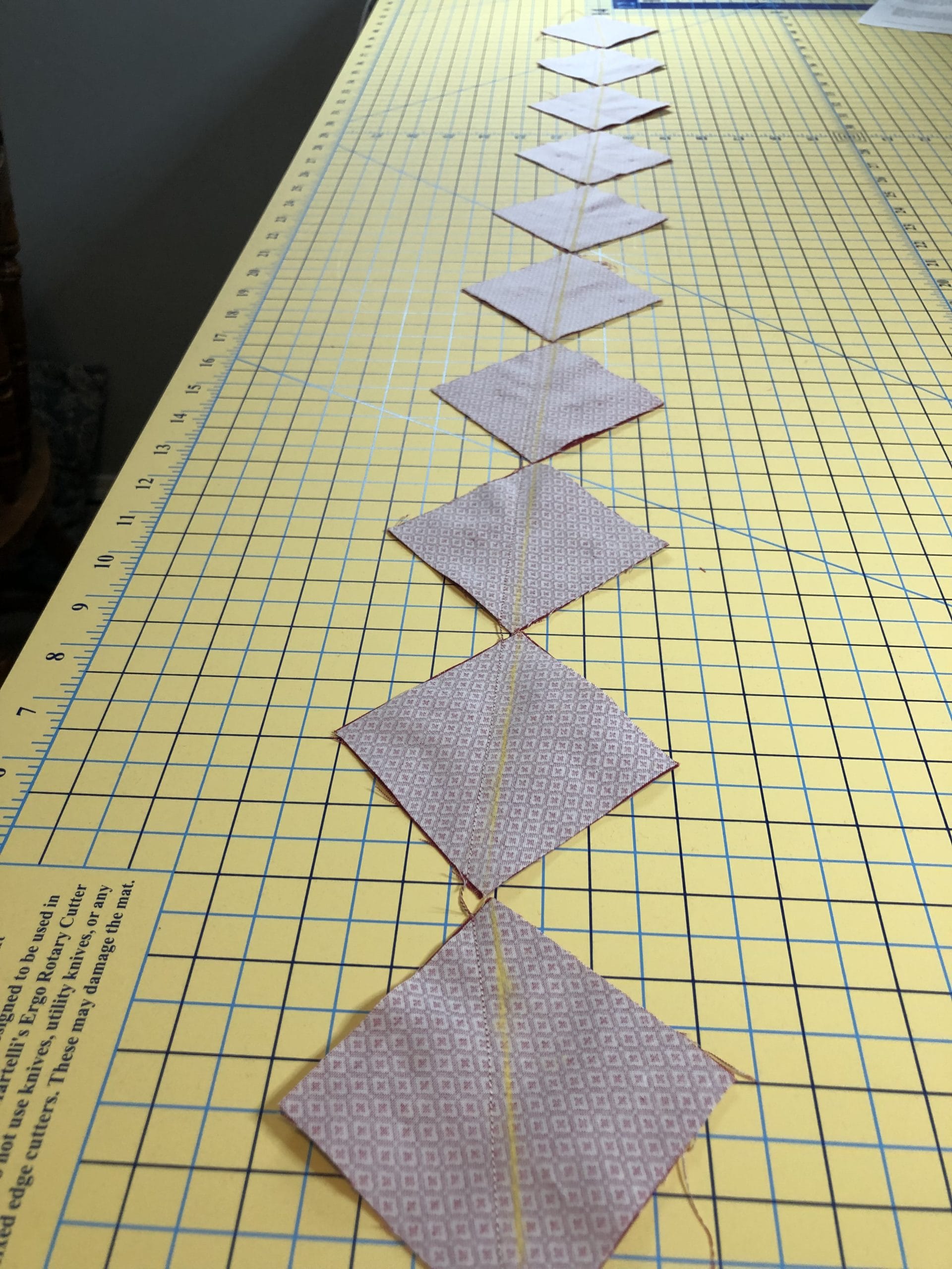 I always do chain piecing whenever possible. Below is a photo of my chain of half-square triangles after my first pass along one side. I don’t clip the strings, but just run the chain back through on the other side. I then clip everything when I’m done.