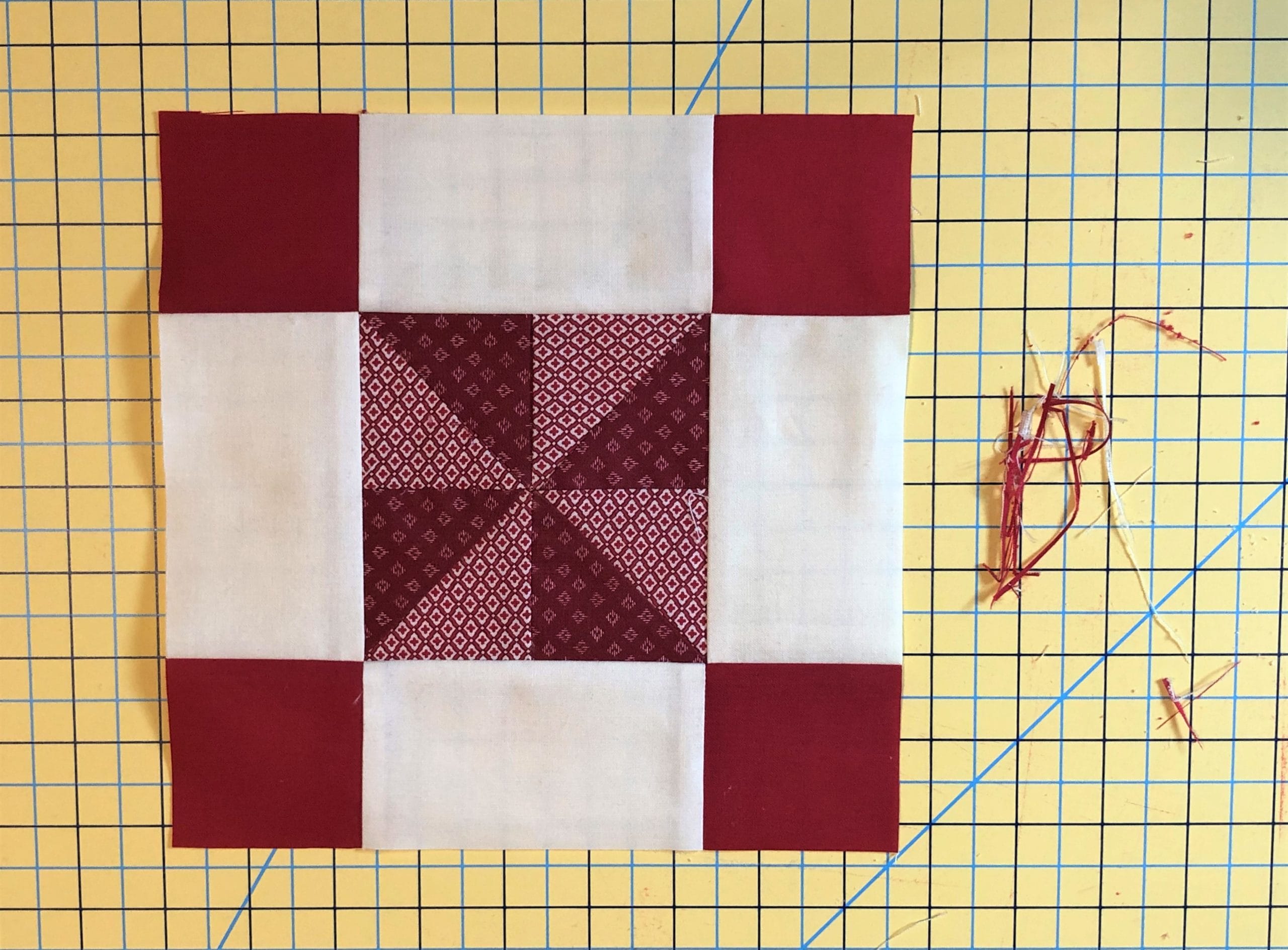 I’ve included a photo of the pinwheels with one showing the back side so you can see how I pressed the center open. This allows the block to lay flat. If you carefully press the center open, it should naturally push one seam up and the other seam down. You should also end up with a tiny pinwheel in the center where you’ve pressed open!