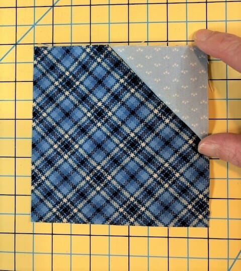 Once the HSTs are sewn and trimmed, I paired them up to get ready to sew them together. Just make sure to keep the Cabin Plaid on the right side of each unit as you sew.