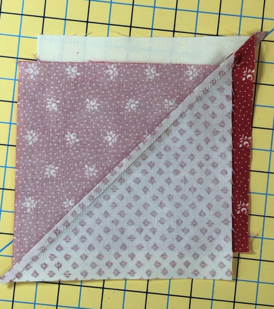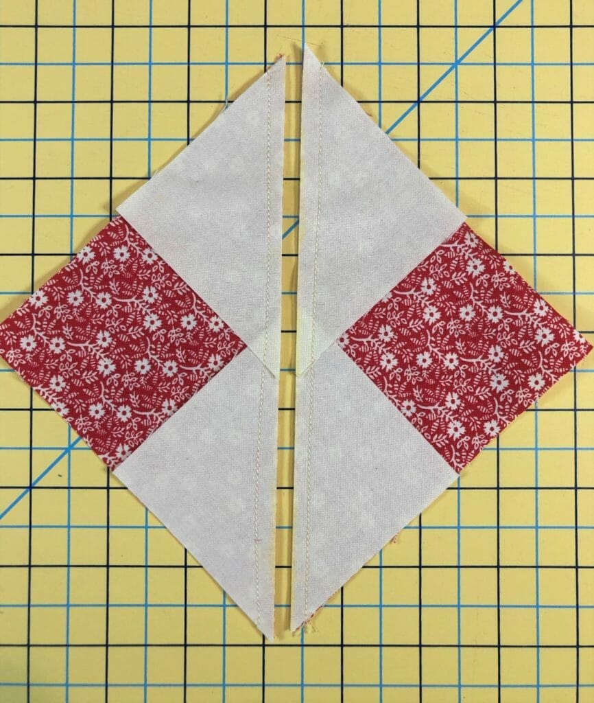 - Trim a ¼” seam allowance from your sewn line. See the reference photo below (I used red thread to make it easier to see!) – you want to trim off the smaller corner, not the entire block: