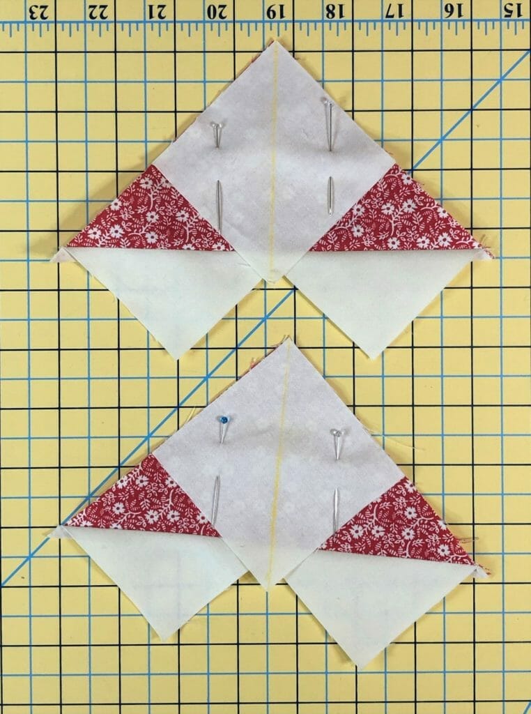 Pin down all of the seams that will be facing your sewing machine – this will help ensure that they remain flat during the sewing process! Take a look below – you’ll see that I pinned the seam in the middle of the Flying Geese block (which is being sewn to your center square):
