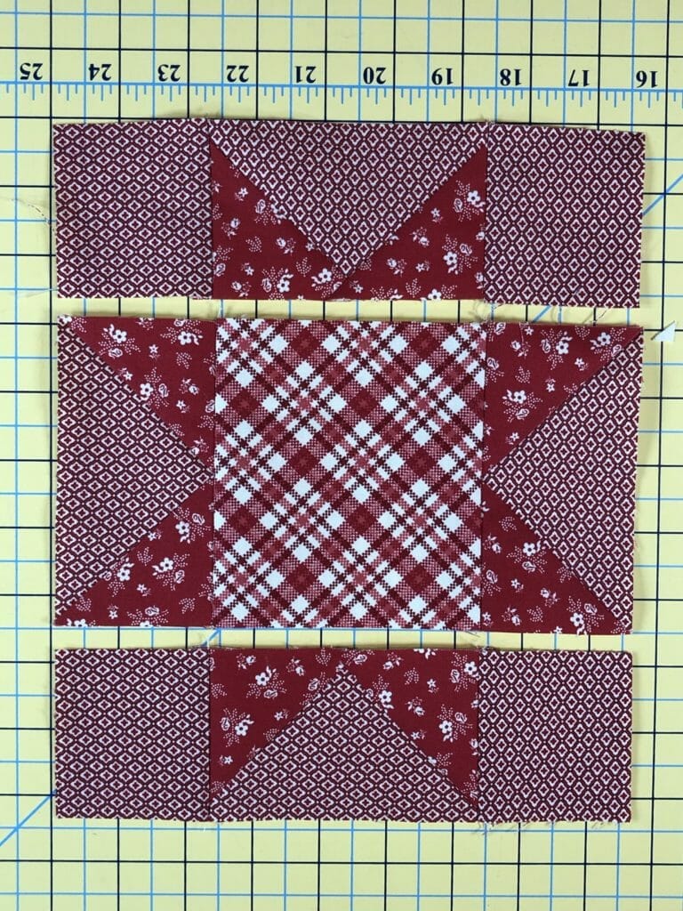 Your middle row will be: one Flying Geese, one center square, one Flying Geese.