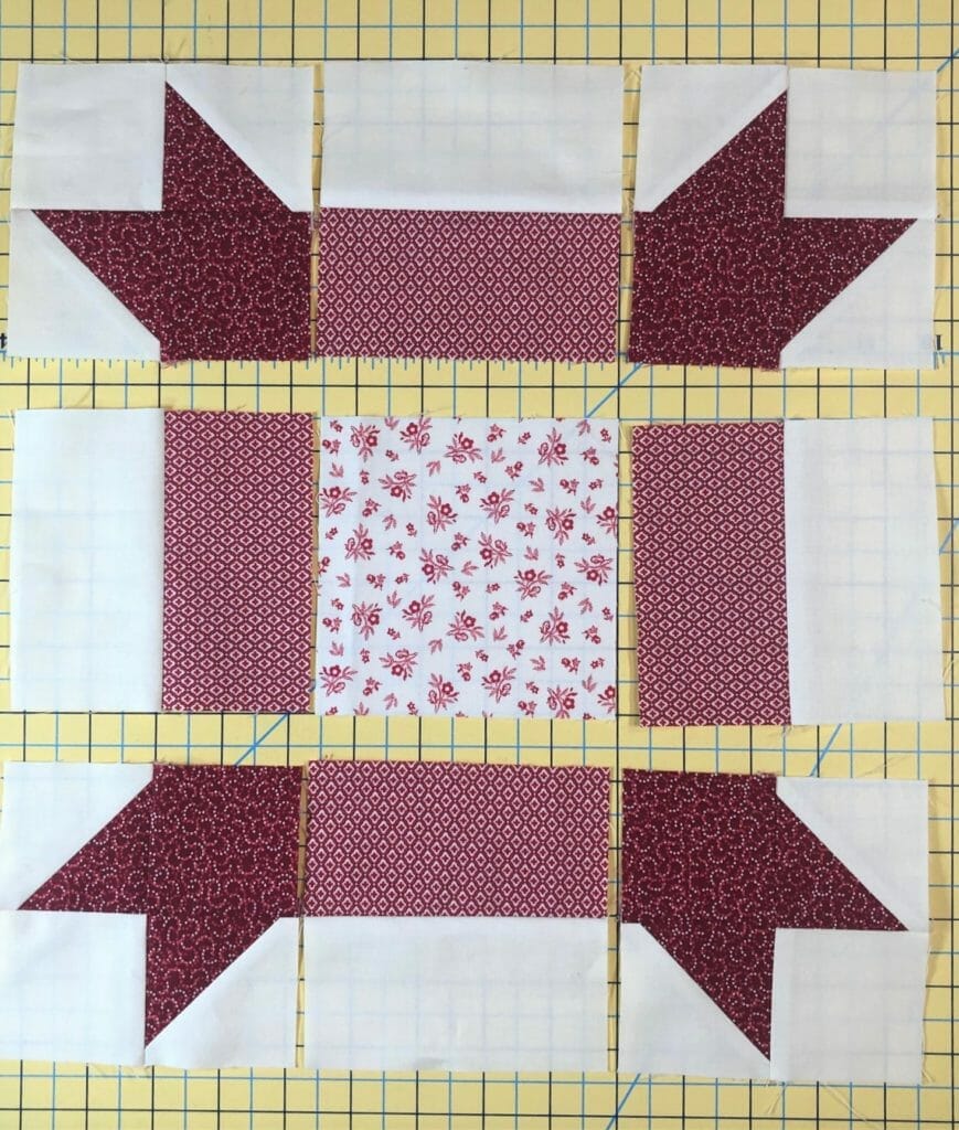 3. Lay out your corner squares, your finished Flying Geese blocks and your center square. See the reference photo below to check placement: