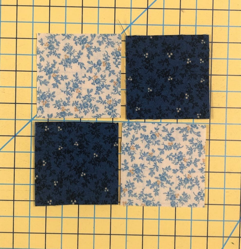 1. Cut your pieces, sizes are listed above in the materials section. You should end up with 4 corner squares & 4 rectangles in your background fabric, and 1 center square & 8 star point squares in your star fabric.