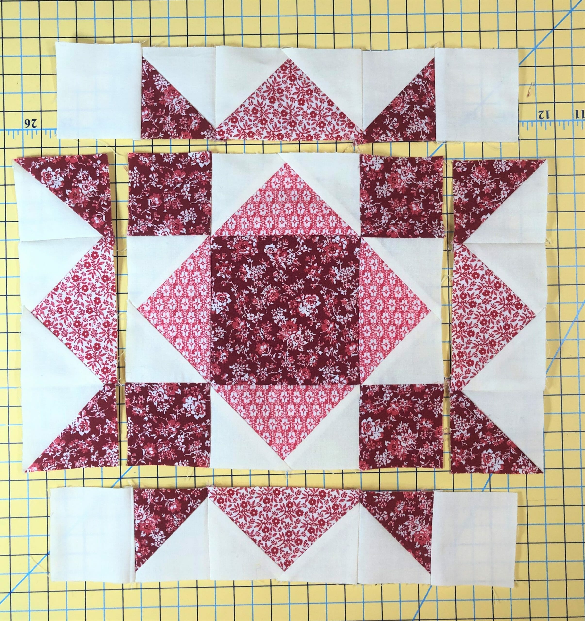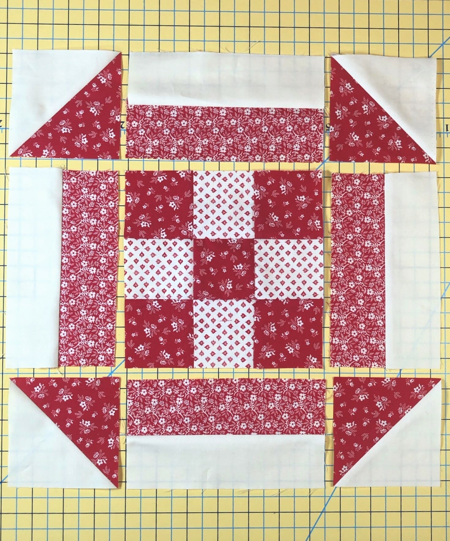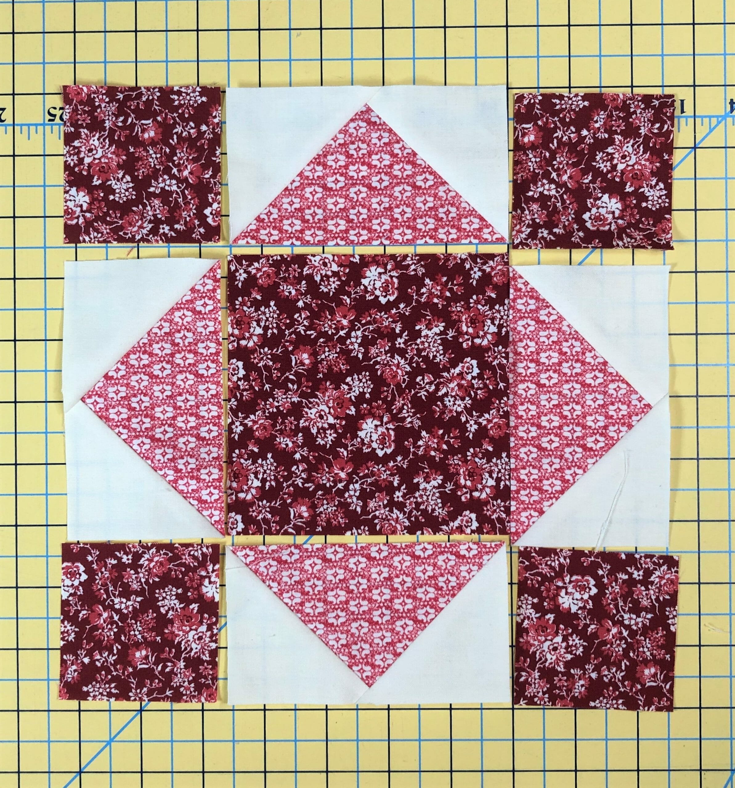 3. Lay out your corner squares, your finished Flying Geese blocks and your center square. See the reference photo below to check placement: