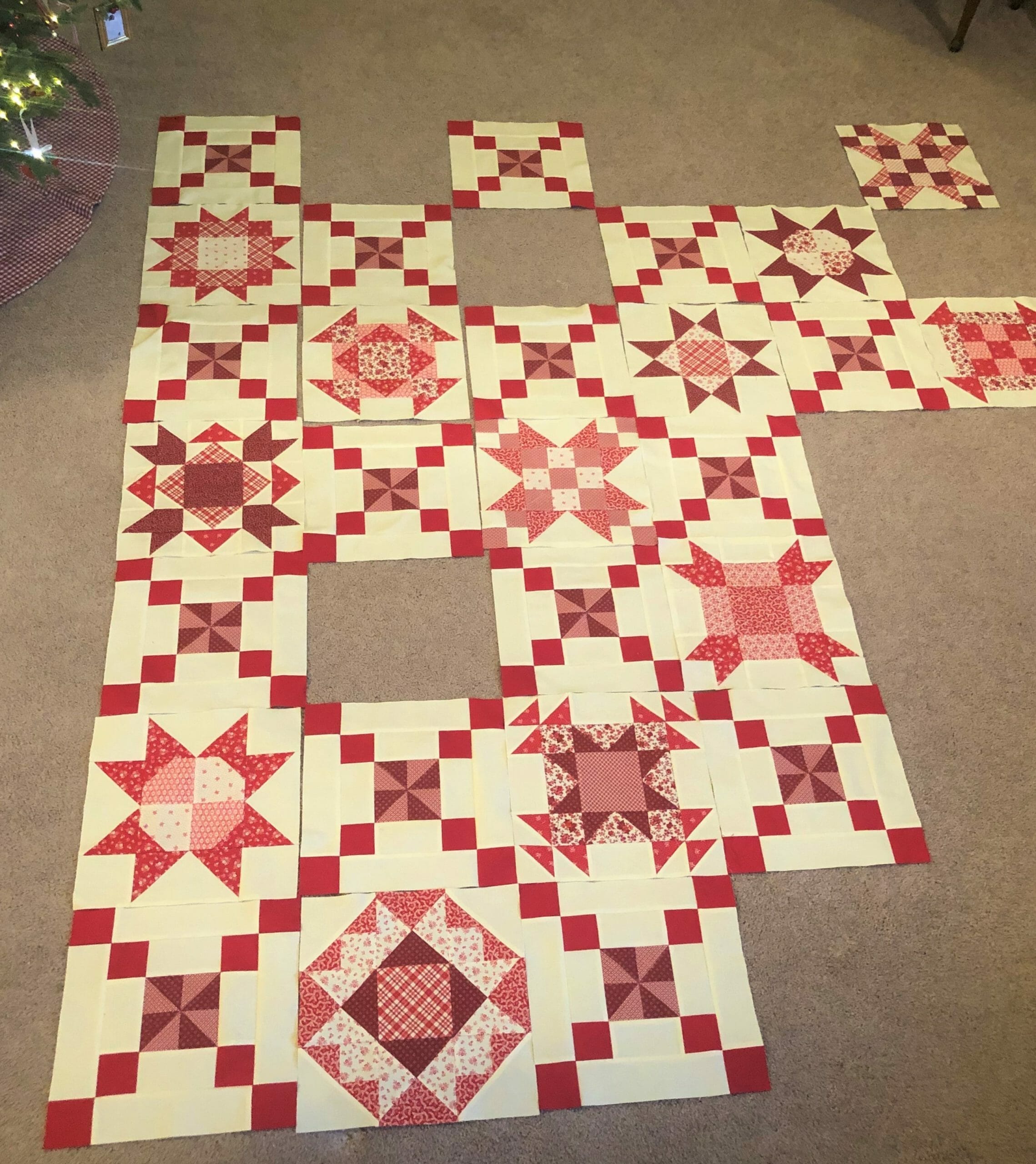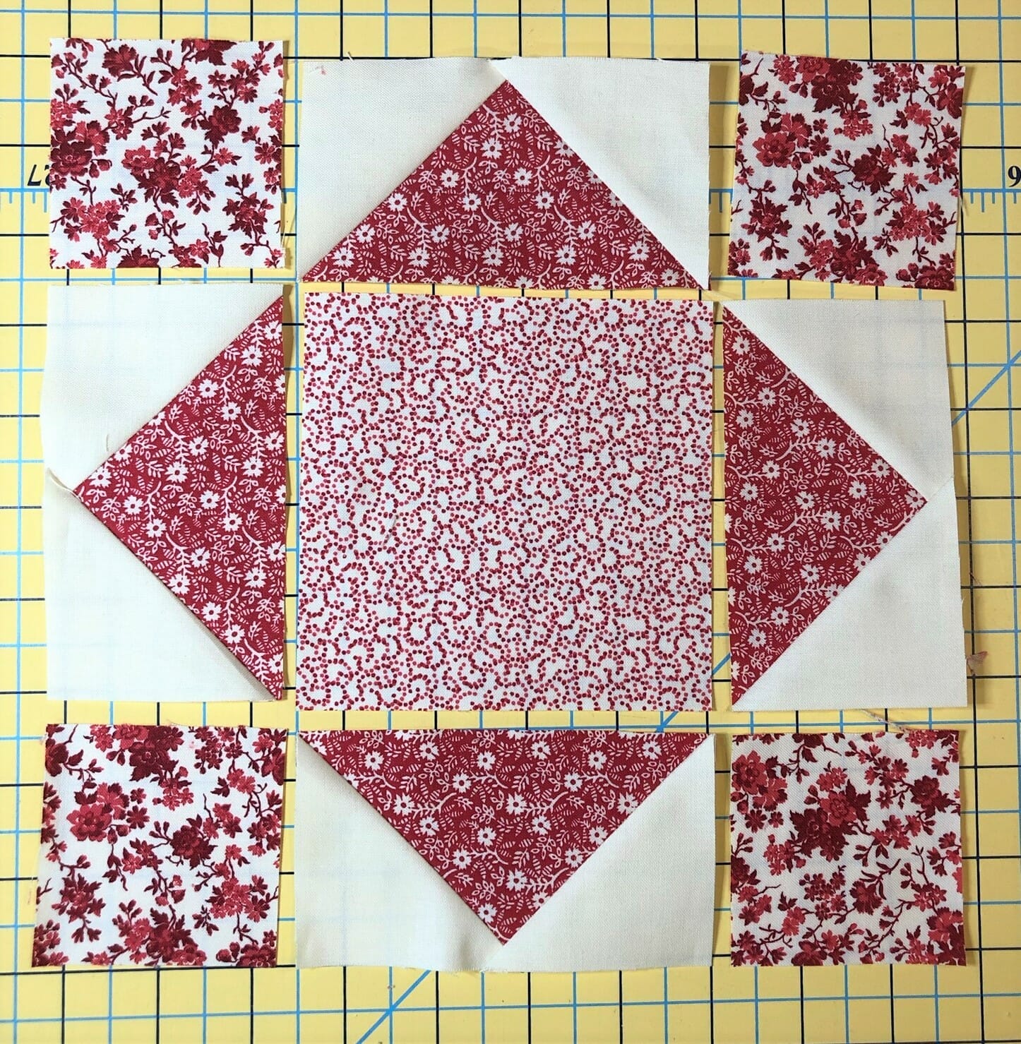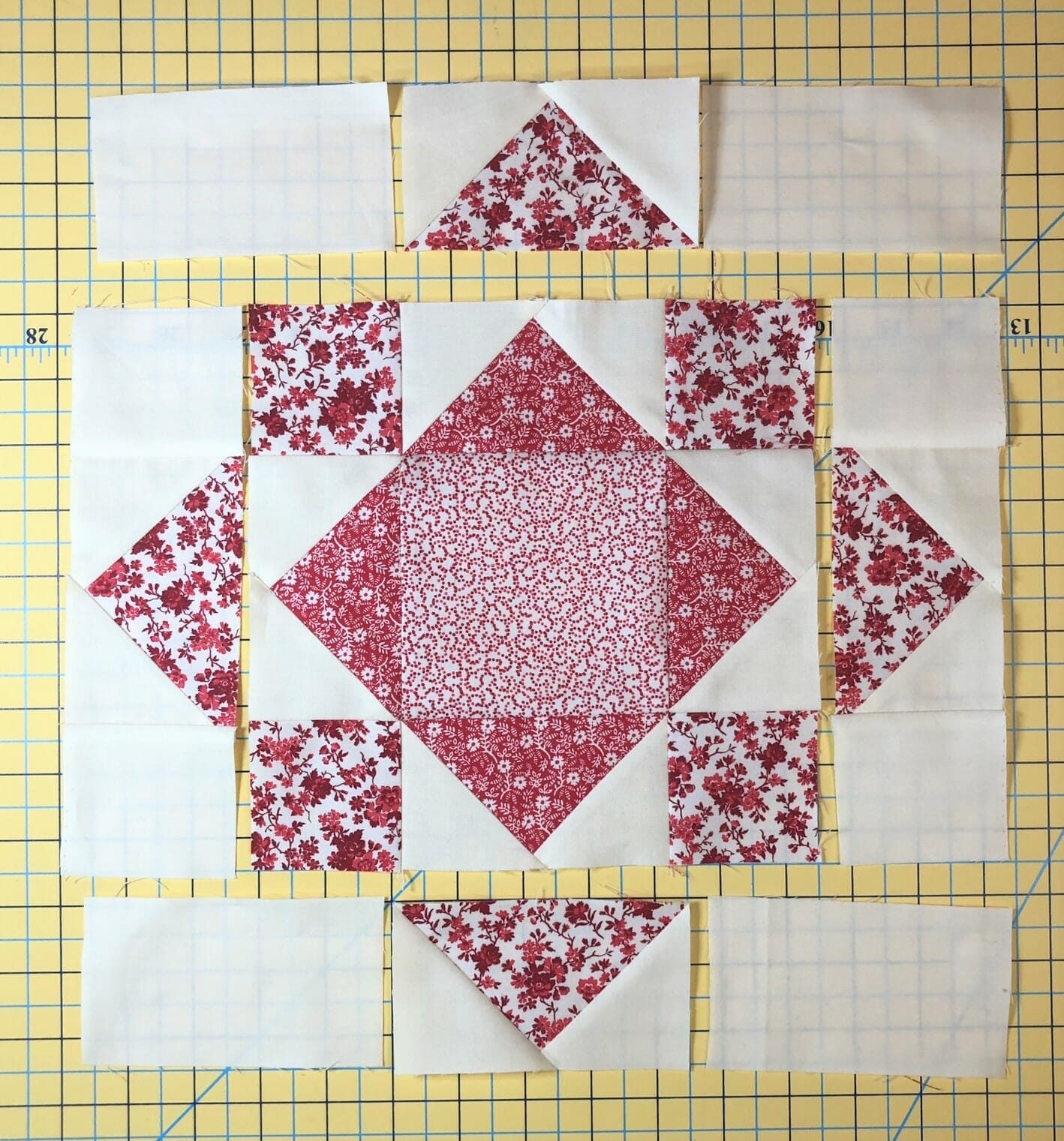 3. Lay out your corner squares, your finished Flying Geese blocks and your center square. See the reference photo below to check placement: