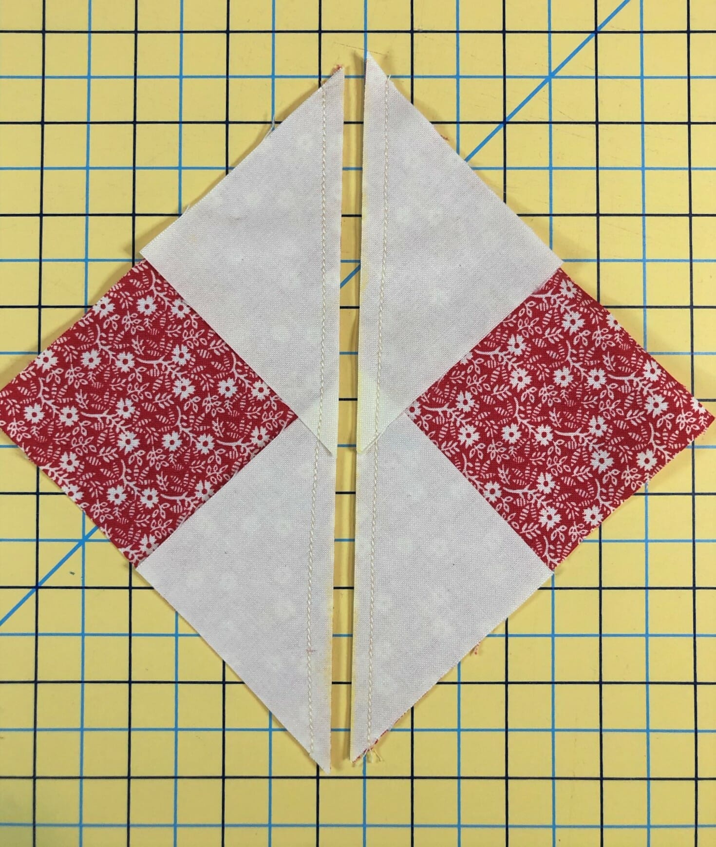 2. Next, you’ll need to create 4 Flying Geese blocks that will be your star’s points. This is a very simple, 1-at-a-time method, but feel free to use whatever you like best!