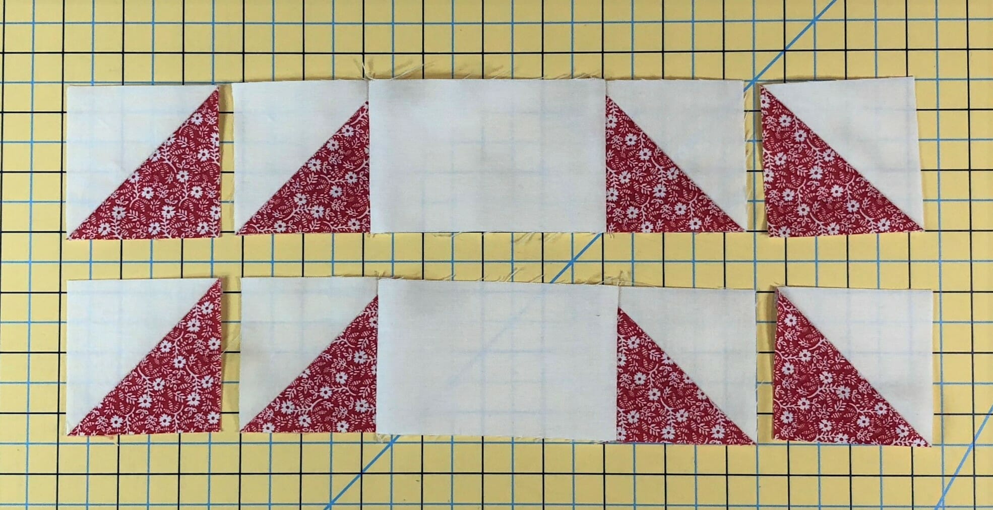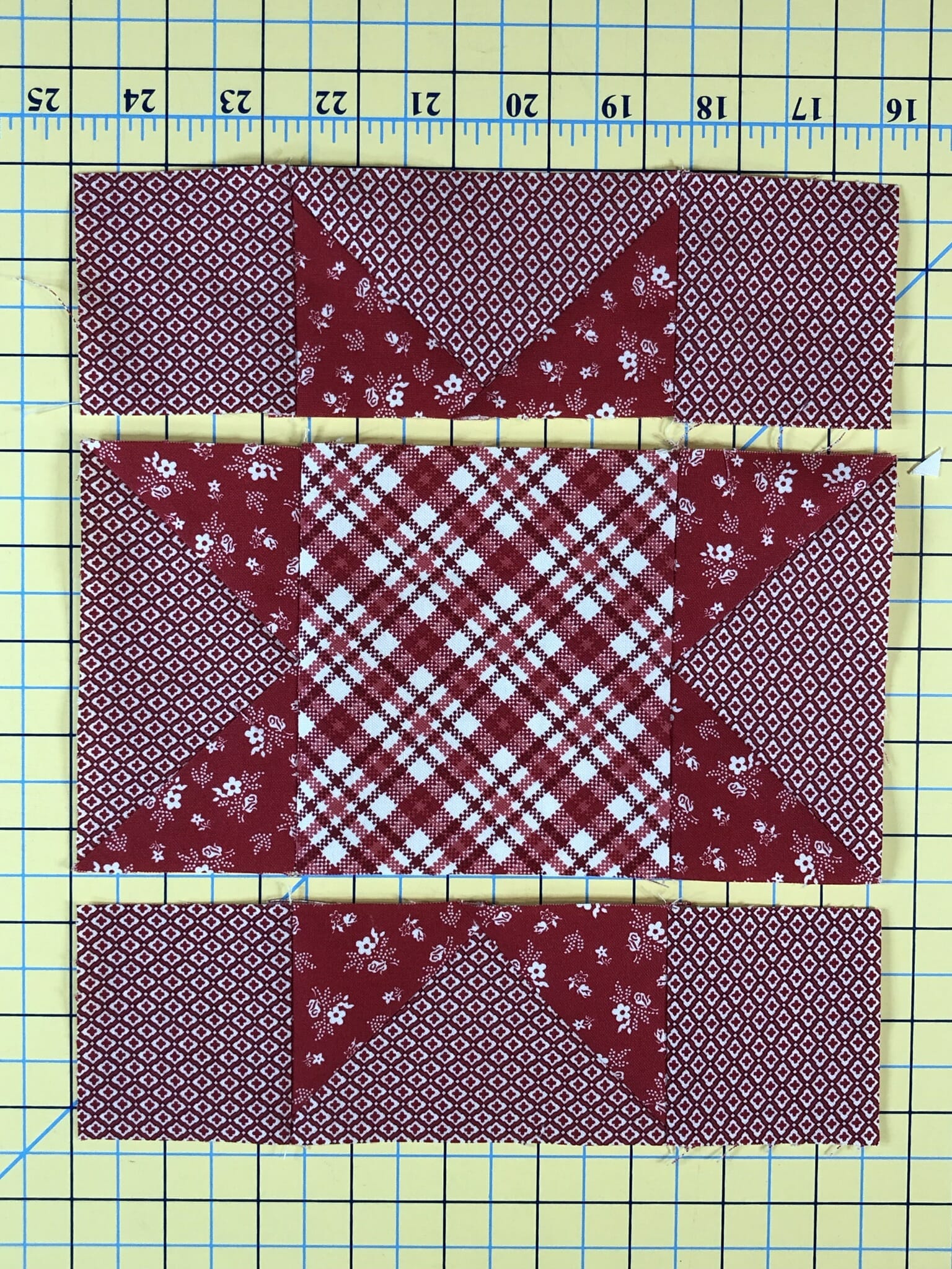 Your middle row will be: one Flying Geese, one center square, one Flying Geese.