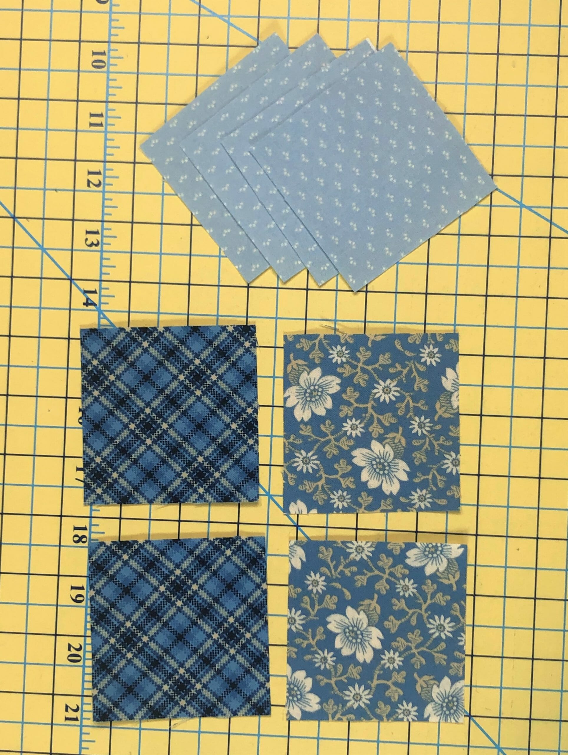 1. Cut your pieces, sizes are listed above in the materials section. You should end up with 4 corner squares & 4 rectangles in your background fabric, and 1 center square & 8 star point squares in your star fabric.